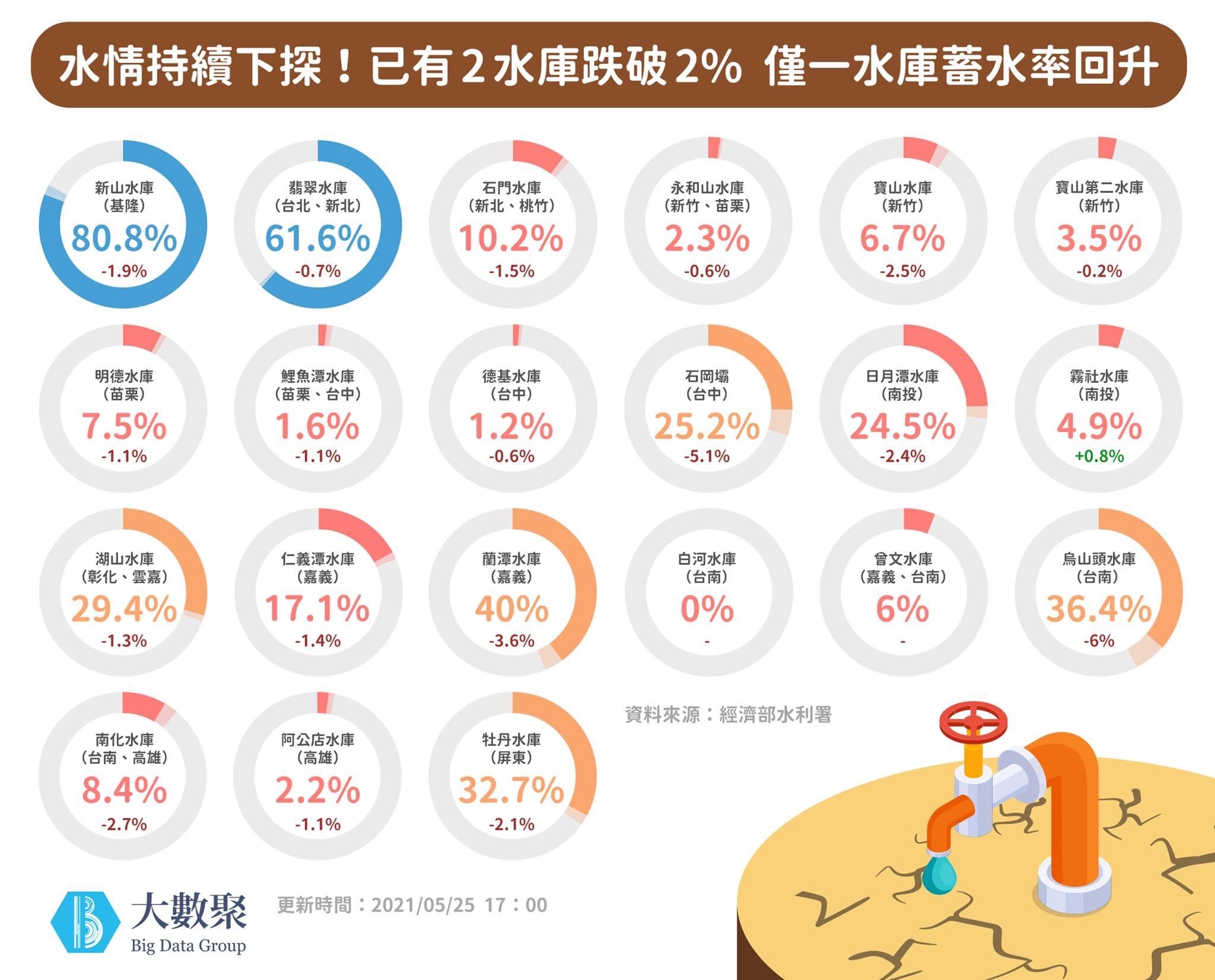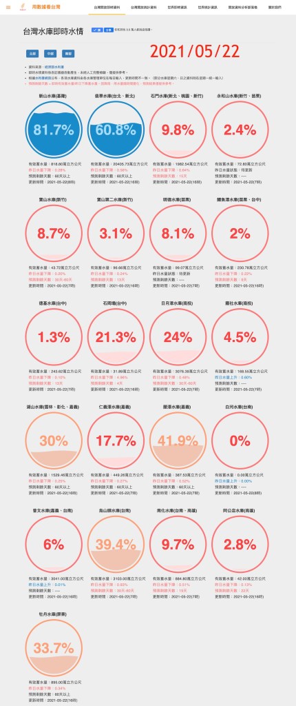 接下來可看所有水庫蓄水量與預測剩餘天數。若連10%都不到的話,那就真的要祈禱天趕快降雨~🥺
