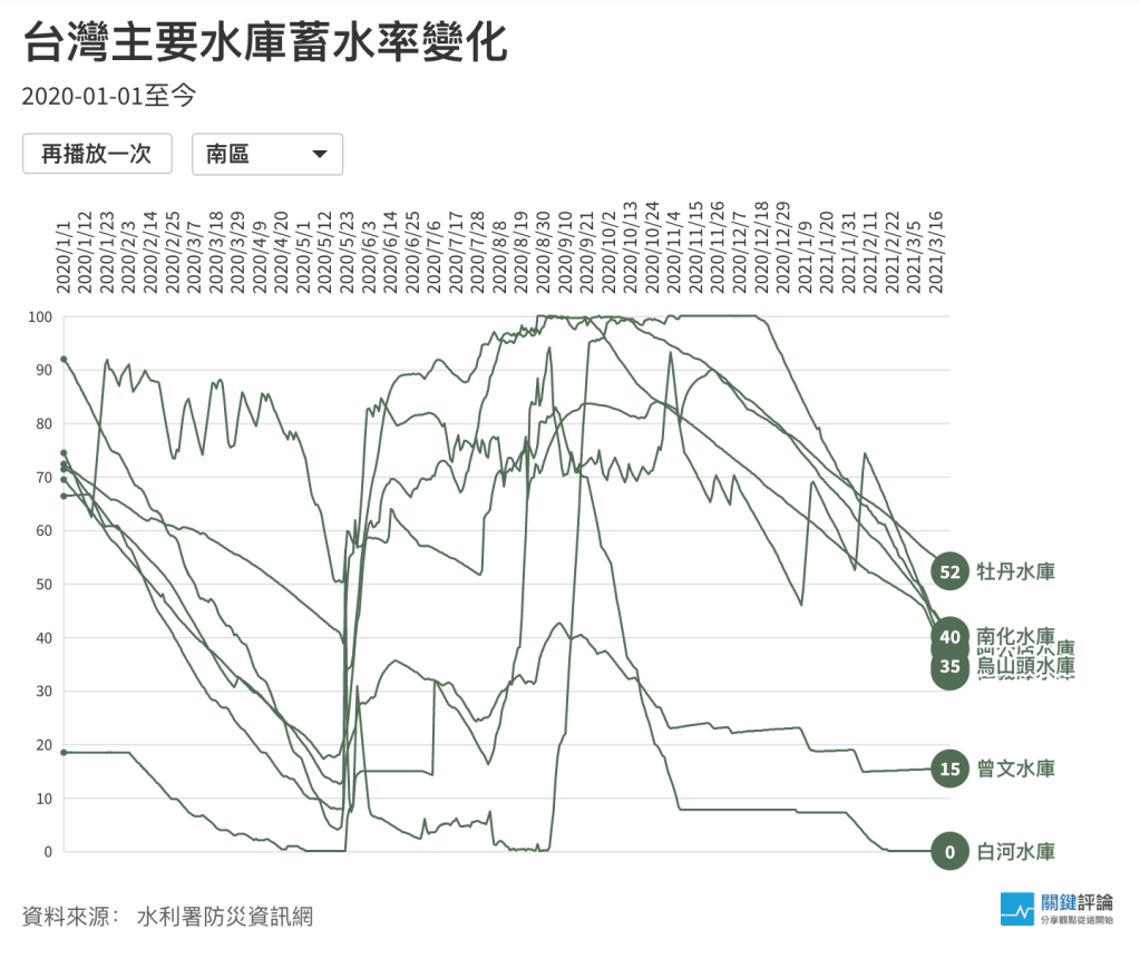來看一下台灣主要水庫蓄水率變化,這張圖是2020/1/1至今,2020/5月底開始有大量雨水進帳,這期間就是所謂的梅雨季,不過颱風季就沒有颱風成功襲擊台灣,以至於延伸至隔年春天就會開始有缺水狀況。