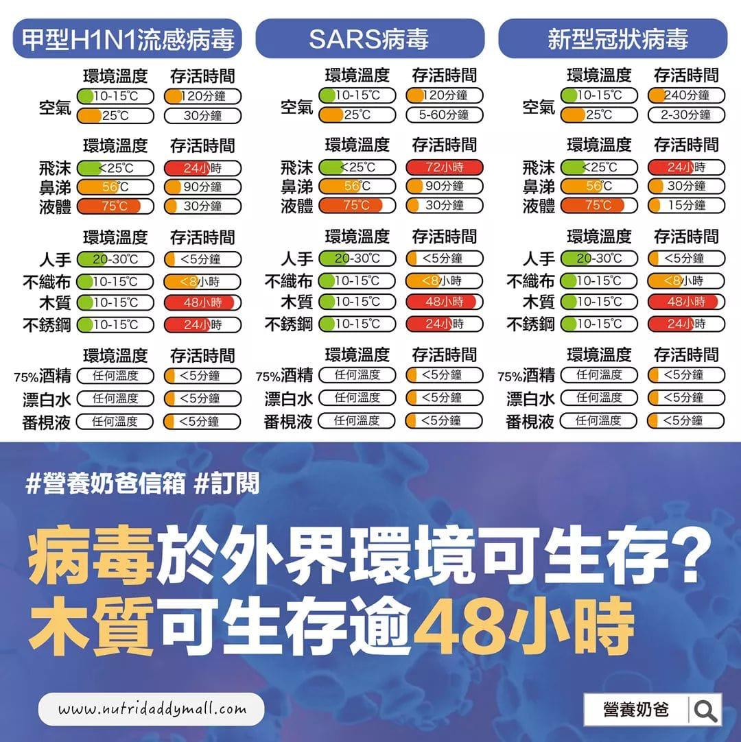 最後來比較一下,三種病毒(甲型H1N1流感病毒、SARS病毒、新型冠狀病毒)存活的時間差異~