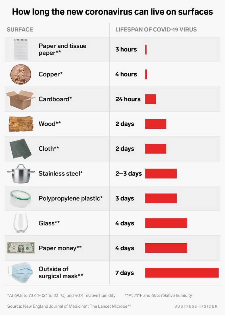 上圖是根據什麼來量化?外國科學研究期刊《The Lancet Microbe》根據病毒的活性,研究新冠病毒在各種物體上所存活的時間。專家發現,病毒在物體上存活所取決的因素有多項條件,包含物體材質、周圍環境溫度與濕度,還有表面類型等。為了讓研究保持在同一個假設條件上,專家在溫度固定於21度、相對溼度保持65%的空間內測試新冠病毒的壽命。🧐