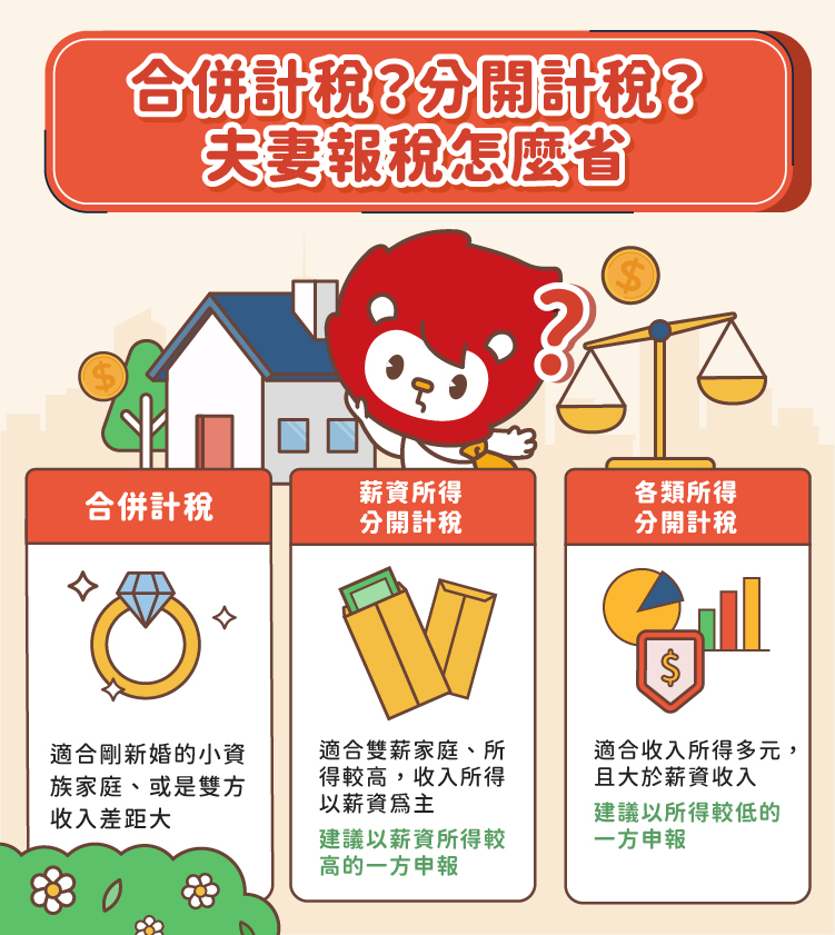目前夫妻報稅有三種計算方式,就看哪一種可以報最少税,來決定最有利的那一種即可!以我的狀況來說,合併計稅最優~