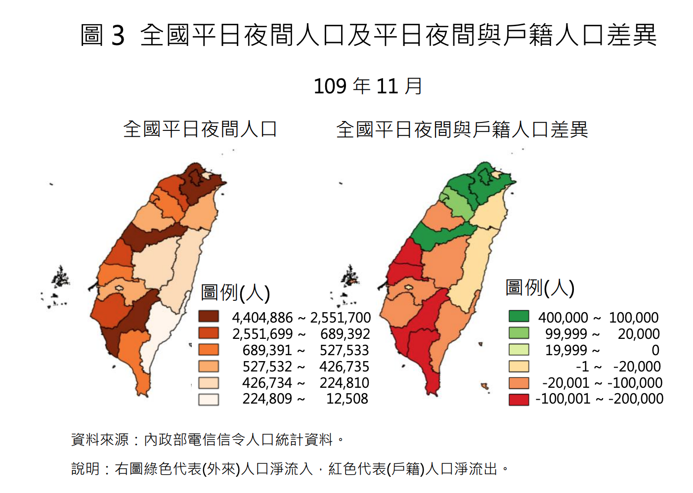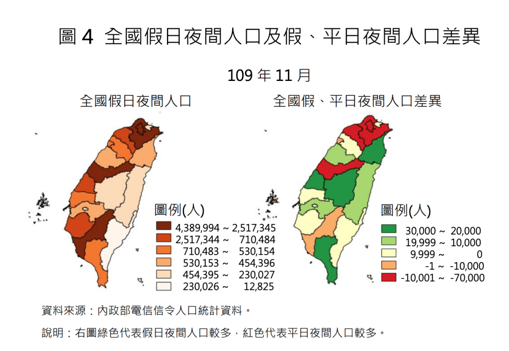 圖一右圖代表全國平日日、夜間人口差異,需要動點腦計算一下,算法也就是【日間-夜間】。可見到台北市是綠色,明顯知道大多數人口往台北市移動上班,而新北市是紅色,則是人口移出最多之地。我本人就是其中之一啦~😃