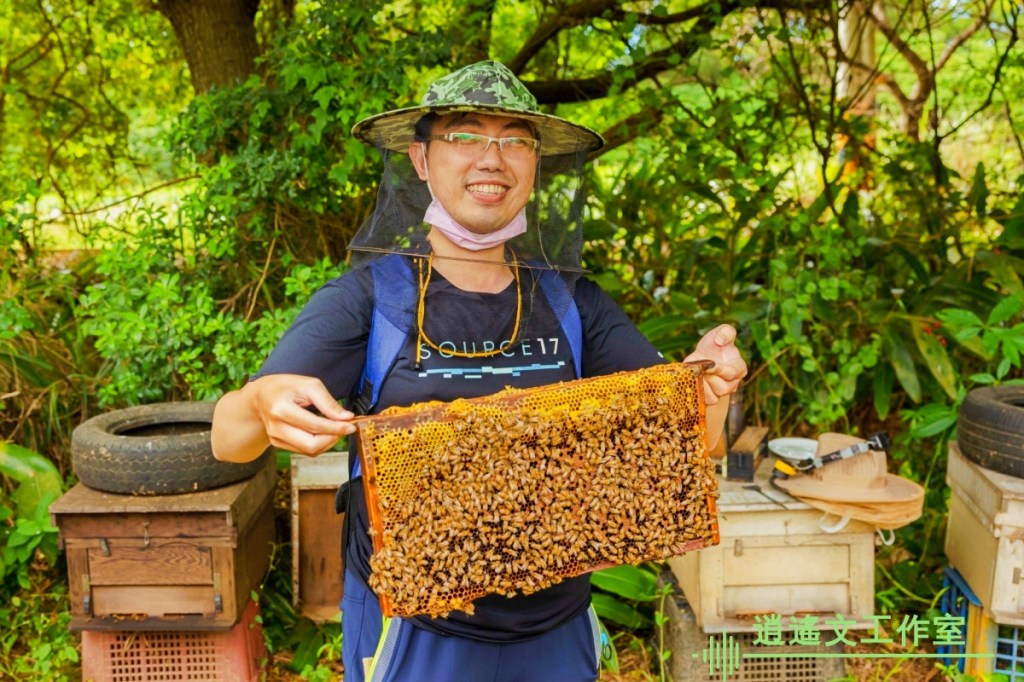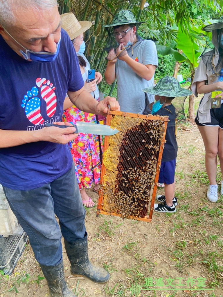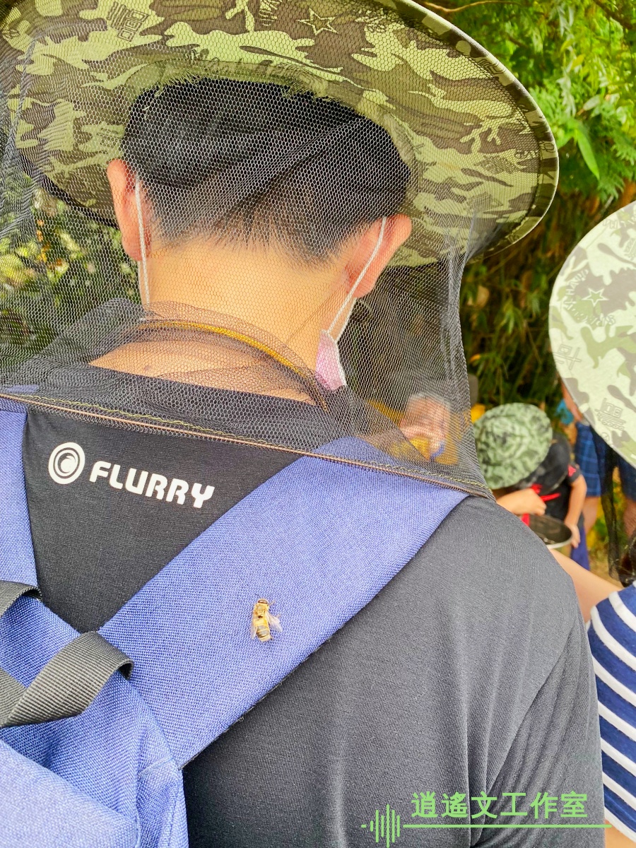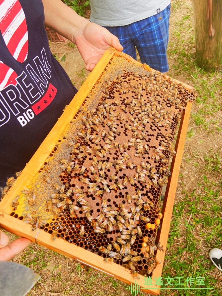 後來我才發覺,這些蜜蜂根本不會螫人,因為牠沒有尾刺,我們每個人頭戴網紗帽,儘管毫無作用,但顯得有參與感囉~