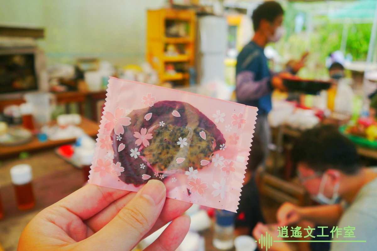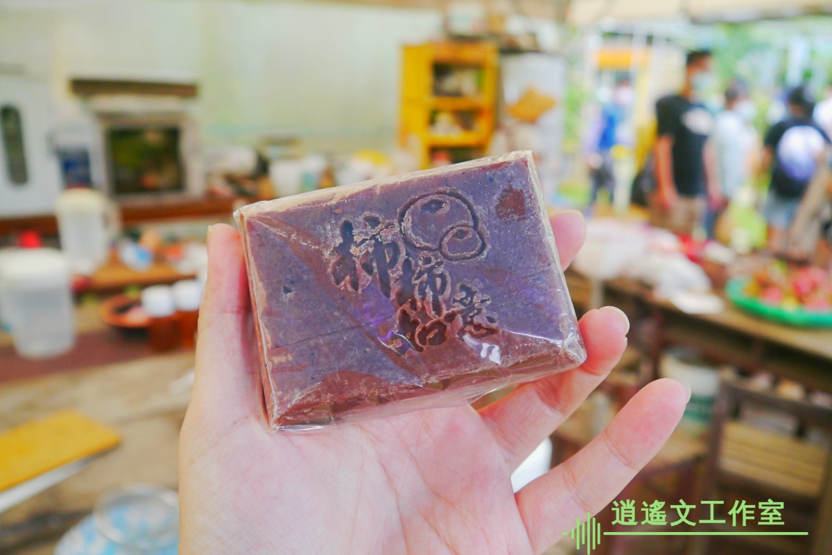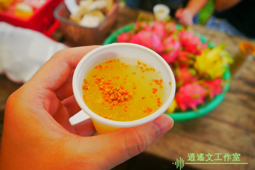 對了,入場時每人有一張抵用券 100 元,可以現場買東西折抵。我端詳現場所有產品,有火龍果(黃金和兩色)、火龍果乾、各種口味的蜂蜜、手工肥皂等等,最後我買了一塊薑黃手工皂,帶回去慰勞蘇菲雅。