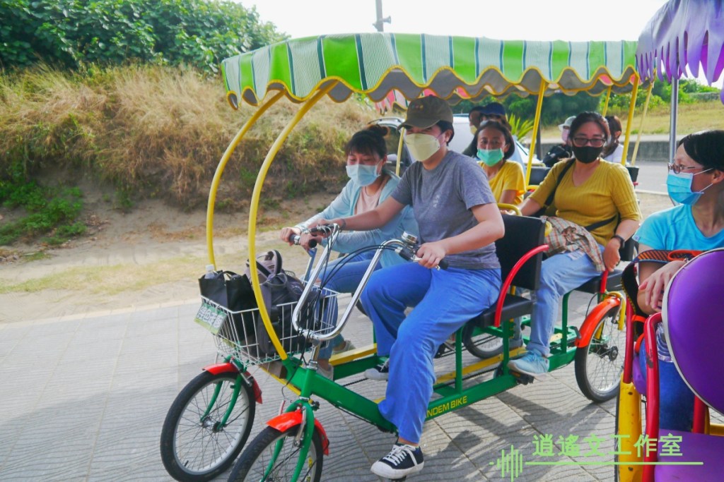 最後一個行程,就是去西北海岸騎腳踏車,這個地方叫做濱海綠色走廊,我們在可停車的租借店家下車,看到外頭擺放好多輛四人協力車,我們共要租賃 6 台,出發前早已分配好隊員,就各自帶開挑車子。我們都是門外漢,沒發現車身多處生鏽斑駁,以致於騎乘時速度無法加快,也就是耗費大量體力踩踏,依舊緩慢前進⋯⋯