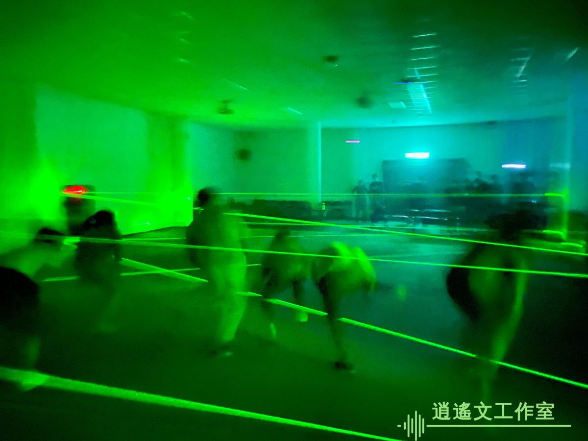 雷射迷宮比泡泡足球輕鬆,儘管是團隊合作,但是並不會相互碰撞。裁判將我們帶到一個籃球場大的室內場地,然後拉下鐵門⋯⋯裡頭好暗,該不會我們要被暗殺了?😱