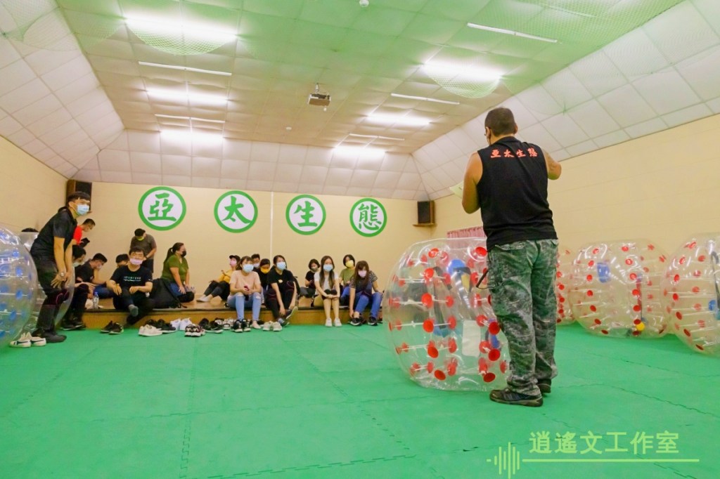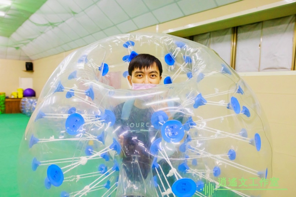 一開始裁判為我們解說穿脫泡泡規則,還有最重要的是安全注意事項!我們單純達到娛樂效果,也不要恣意打鬧爆走。裁判說那泡泡有約 10 公斤,要扛在肩上,還有手抓著拉環。