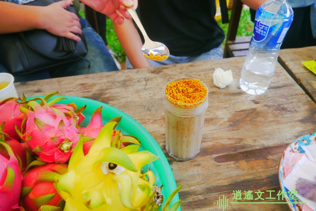 再來養蜂人拿出一個小盒子,我看裡頭一粒一粒兩種顏色,他說這是蜜蜂搜集的花粉,分別是火龍果花和咸豐草花,他請在場的大家拿一些吃吃看,真讓我驚訝~從來沒有吃過花粉的我,那口感像是在吃綠豆糕,只是味道是酸甜。養蜂人見大家意猶未盡,表示等一下會有吃不完的花粉。😛