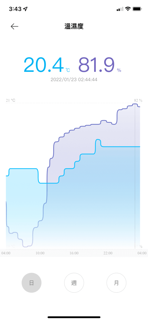 可以看到圖中的變化,早上 10 點開始,我關掉除濕機,離開房間,濕度逐漸升高,清晨四點達到 81%,而氣溫沒太大變化,大約在 20 度上下。