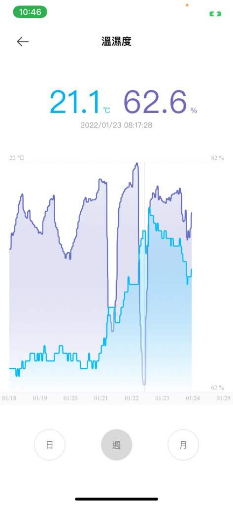 我查看圖表週線,時間半夜兩點到早上八點約六小時的期間,濕度從 81.9% 降到 62.6%,這種較低濕度的狀態,皮膚確實感覺到很舒適。🙃