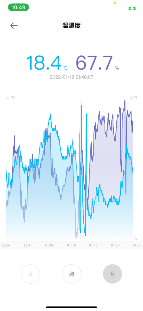最後來看一下圖表月線,可以發現 1/10 前後有很大的差異,其中原因是在於我把小米溫濕度計,從玄關拿到房間,於是就會發現後半段的數據是另一個世界。這也表示,我的臥室濕氣一直都很高,真有必要使用除濕機,來把空氣中的水氣降低。