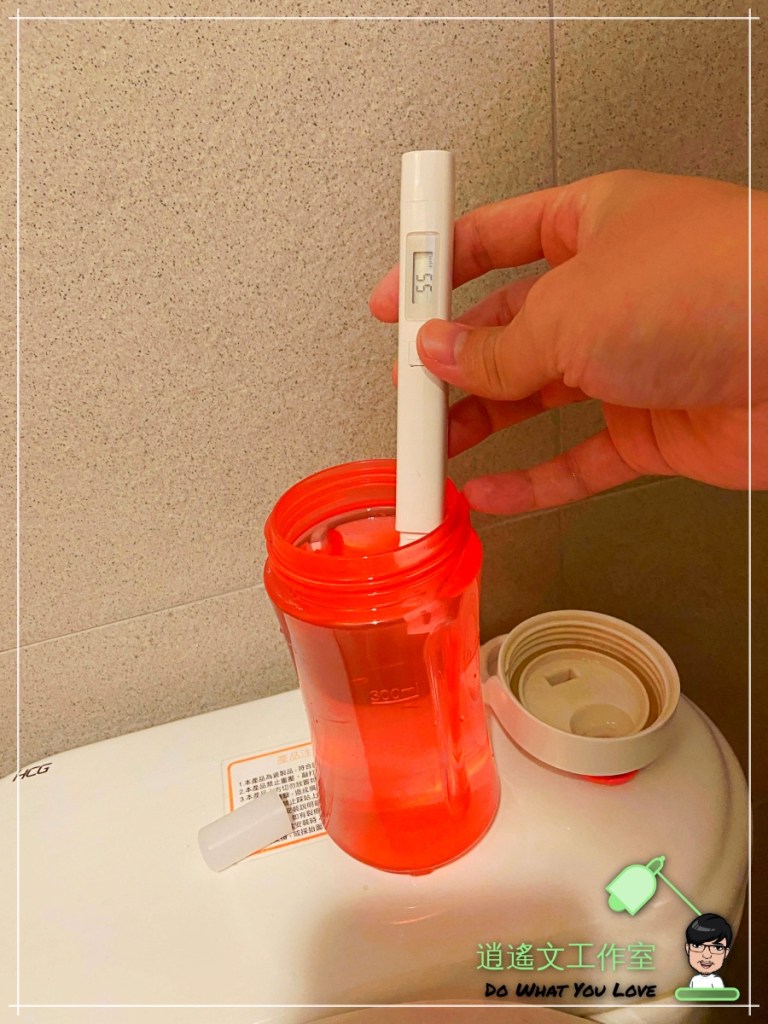 我用紅色半透明瓶子裝的是辦公室桶裝水喔~因為不好意思在現場拍照,只好躲到廁所測量~😜