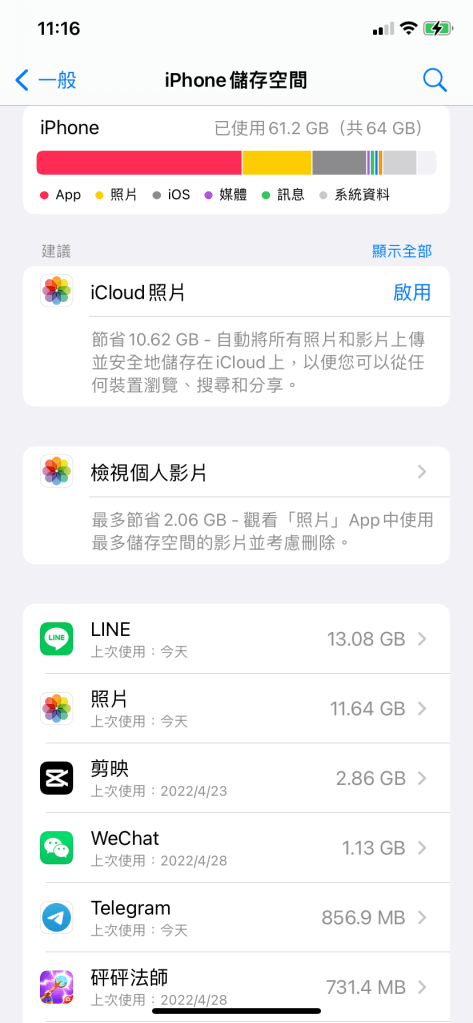 2019 年買了 iPhone 11,但只是買最低容量 64G,以為自己會有空備份,但實際上很快就滿,愛拍照的我,三不五時就得刪除舊的照片或沒在用的 App。