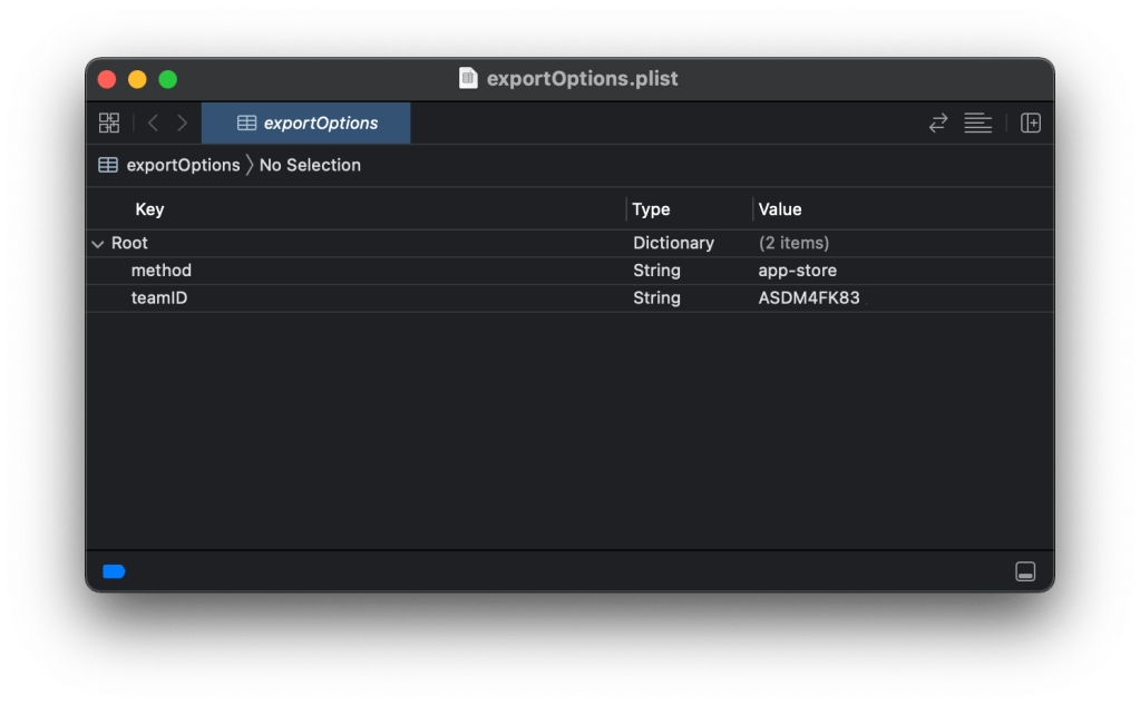 -exportArchive 有一個檔案 exportOptions.plist。不用自己建立,可以使用 Xcode 匯出 ipa 檔後,從匯出的資料夾裡獲取。名字為 exportOptions.plist,修改一下名字就行了。