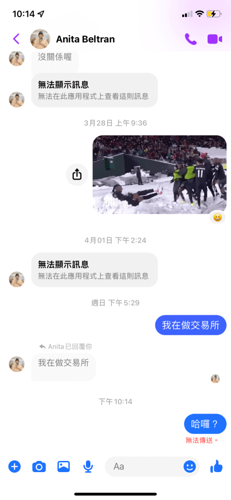 可以看到明明是同一個帳號,卻換了不同的大頭照。這位嫌疑犯還真是有耐心,三不五時問候我。我發現每隔一段時間,我就無法傳訊息給她,想要去 Facebook 看她的動態牆,居然無法查看!
