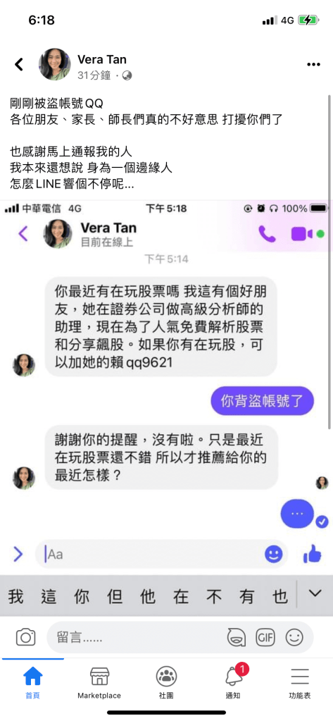 此外,除了真正的詐騙帳號外,也有朋友臉書帳號被盜用。嫌疑犯會拿此帳號去密訊臉書好友,介紹各種投資管道,想要誘使朋友上鉤。若朋友警覺性高,能立刻知道是帳號被詐騙嫌疑犯盜用,透過其它通訊軟體聯絡苦主。