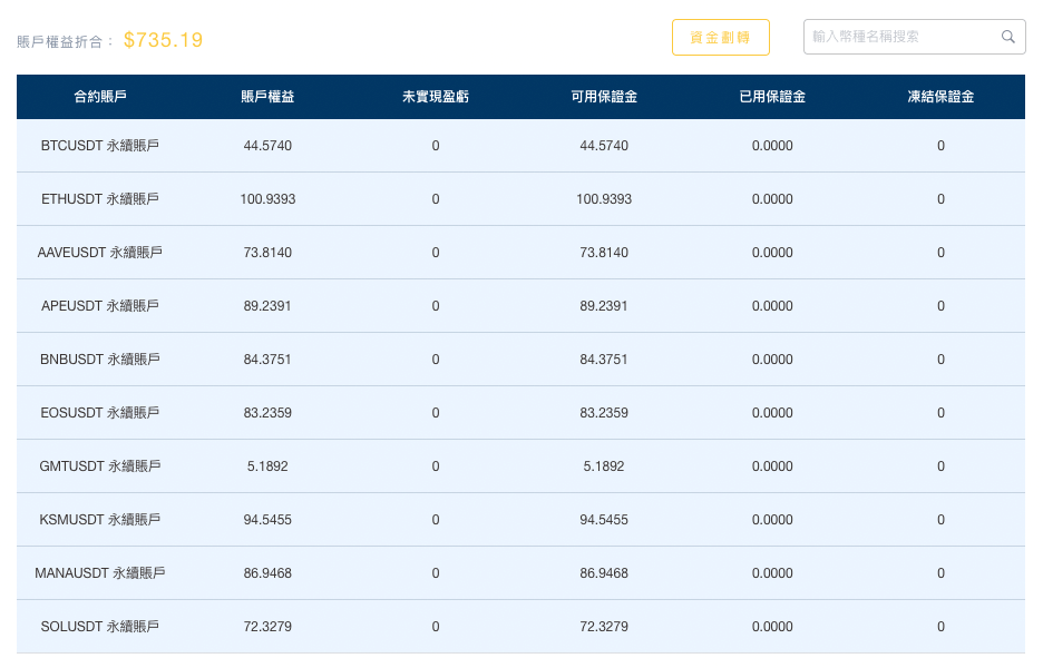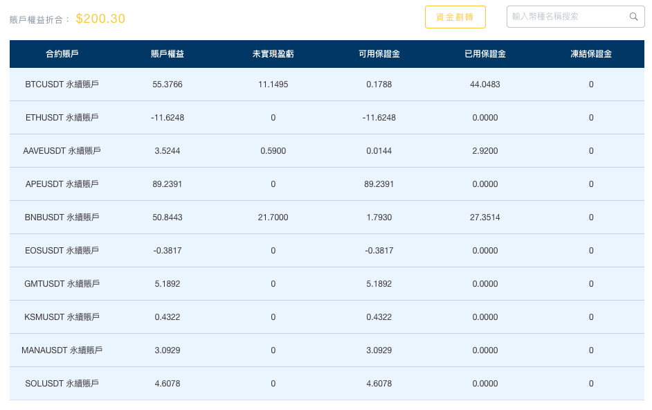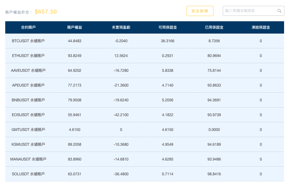 比賽結束前,大家要各自平倉,這樣才好結算成績。10 種大小加密貨幣,我各投 100 USDT 做開空合約,看我帳戶權益,就知道各虧了多少!?
