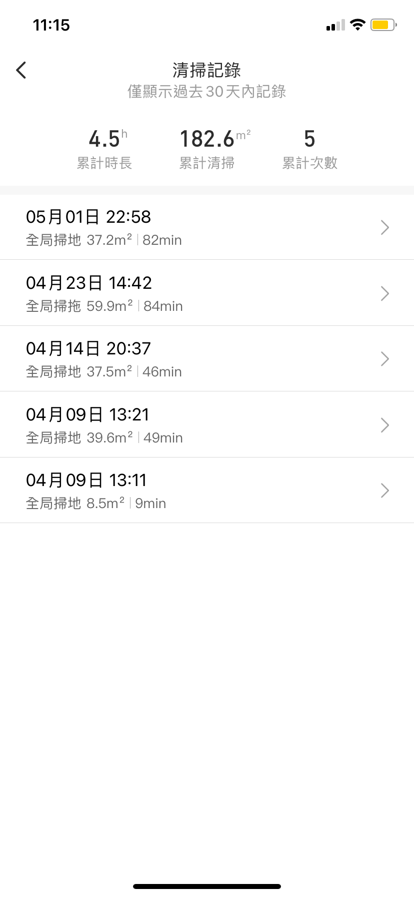 平均一週我會呼叫掃拖機器人幫我打掃一次,App 可以查看 30 天內打掃紀錄,可看到全部掃拖完一趟要 80 分鐘左右。