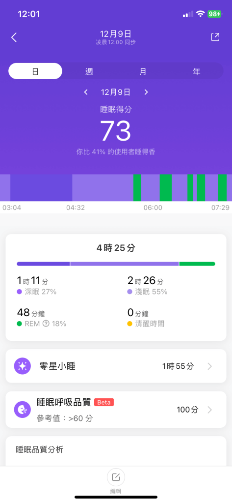 可見到上圖,小米手環 6 幫我記錄的入睡狀況,差不多三點才認為我真的睡著,三點以前都在反反覆覆沒有睡著。