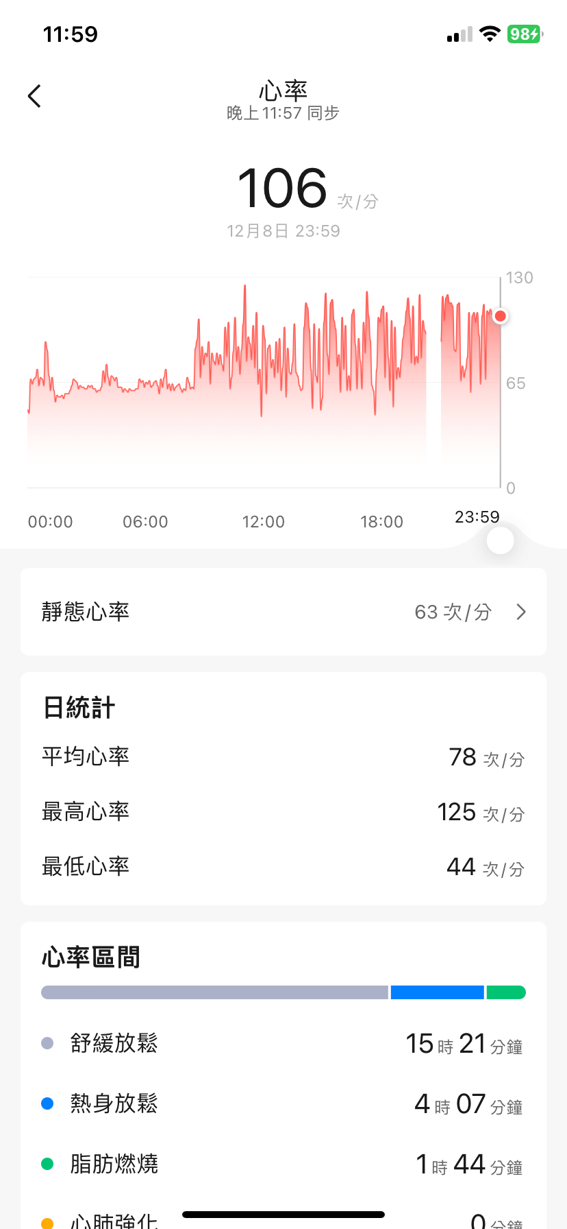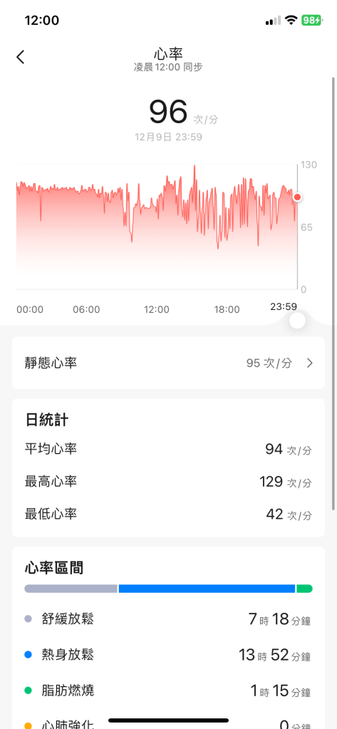 可見到上圖兩天(12/9 與 12/8)心率狀況,12/9 是我發病最嚴重的一天,一整天心率都在 100 次/分 上下(靜態心率 95次/分),就連睡覺時間也是,這也就代表難以入睡的狀態。12/8 下午症狀才開始要發作,這一天睡眠狀況良好(靜態心率 63 次/分)。