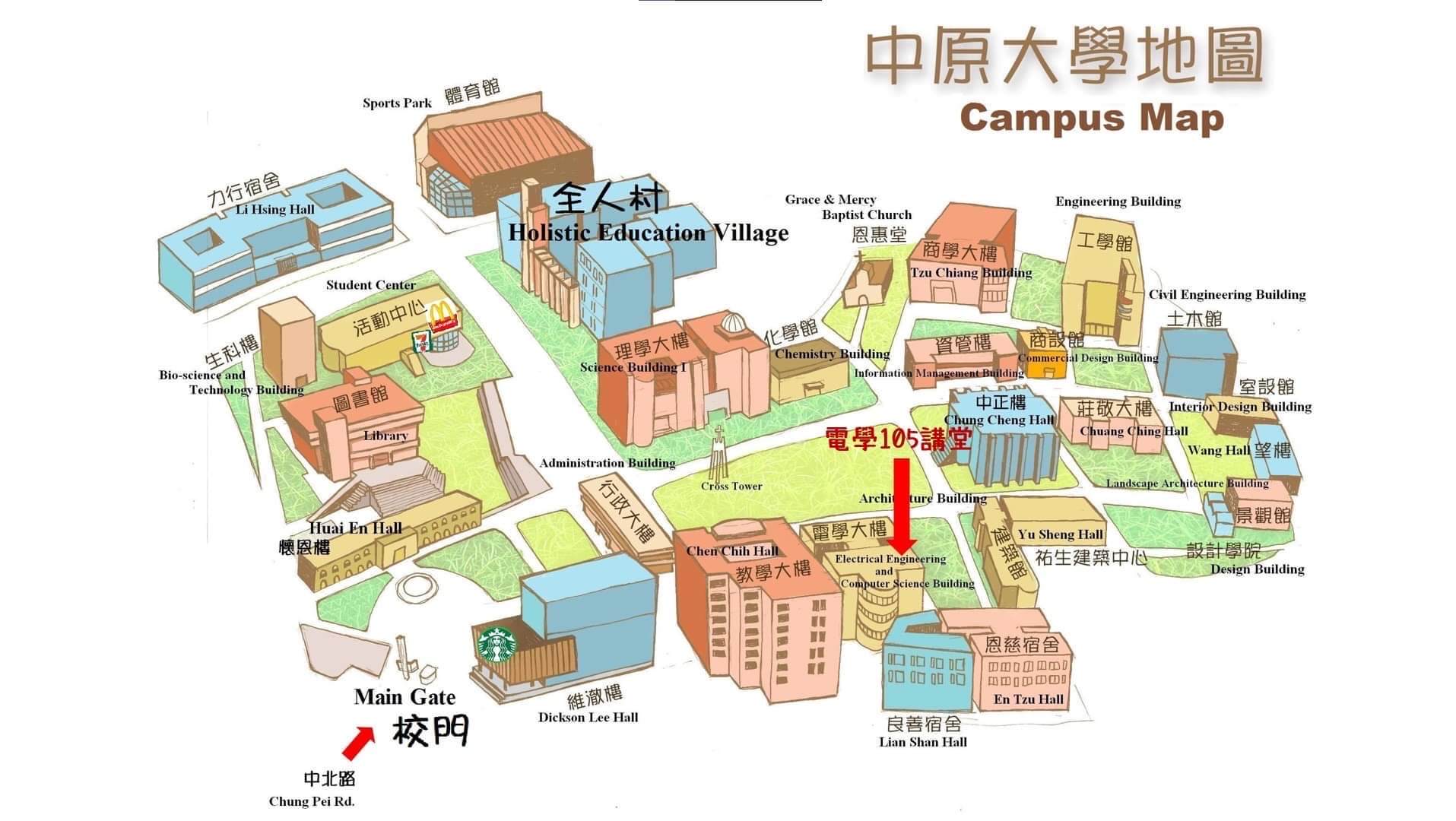 中原大學看起來很大,這是負責聯絡我的同學 Email 傳給我的地圖。我下車漫步校園,腳步感到輕盈緩慢,懷念學生時代挺悠哉。