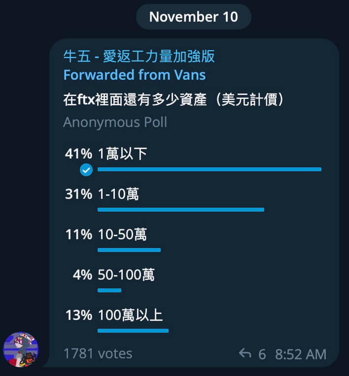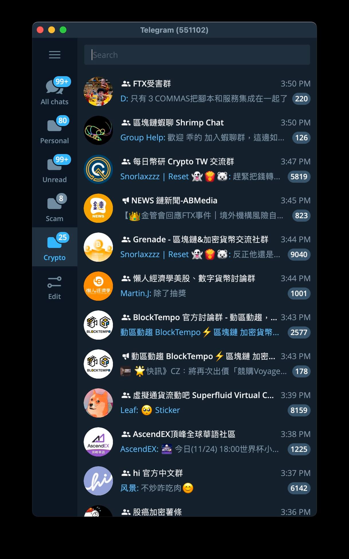當前我會使用 Telegram 和 Line 來持續關注加密貨幣產業動態,不過每天資訊量過於龐大,我很少點進去看聊天議題,反而現在 FTX 破產,我便想追蹤後續發展,以及被波及受重傷的人是怎樣面對現況與處理後續。