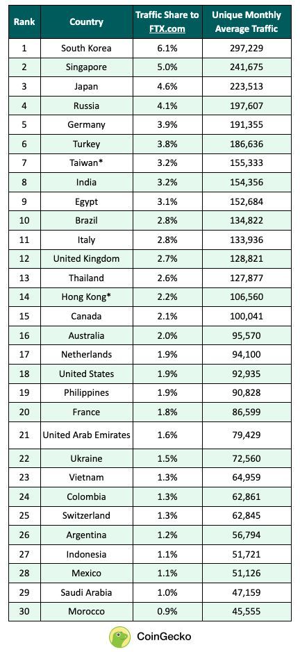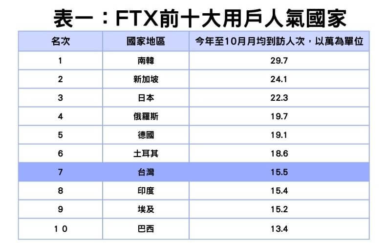 看了 FTX 全世界流量統計,原來台灣是第七大,數據顯示每個月有 15.5 萬人去使用 FTX 交易所服務,看來受影響的人相當多呢~