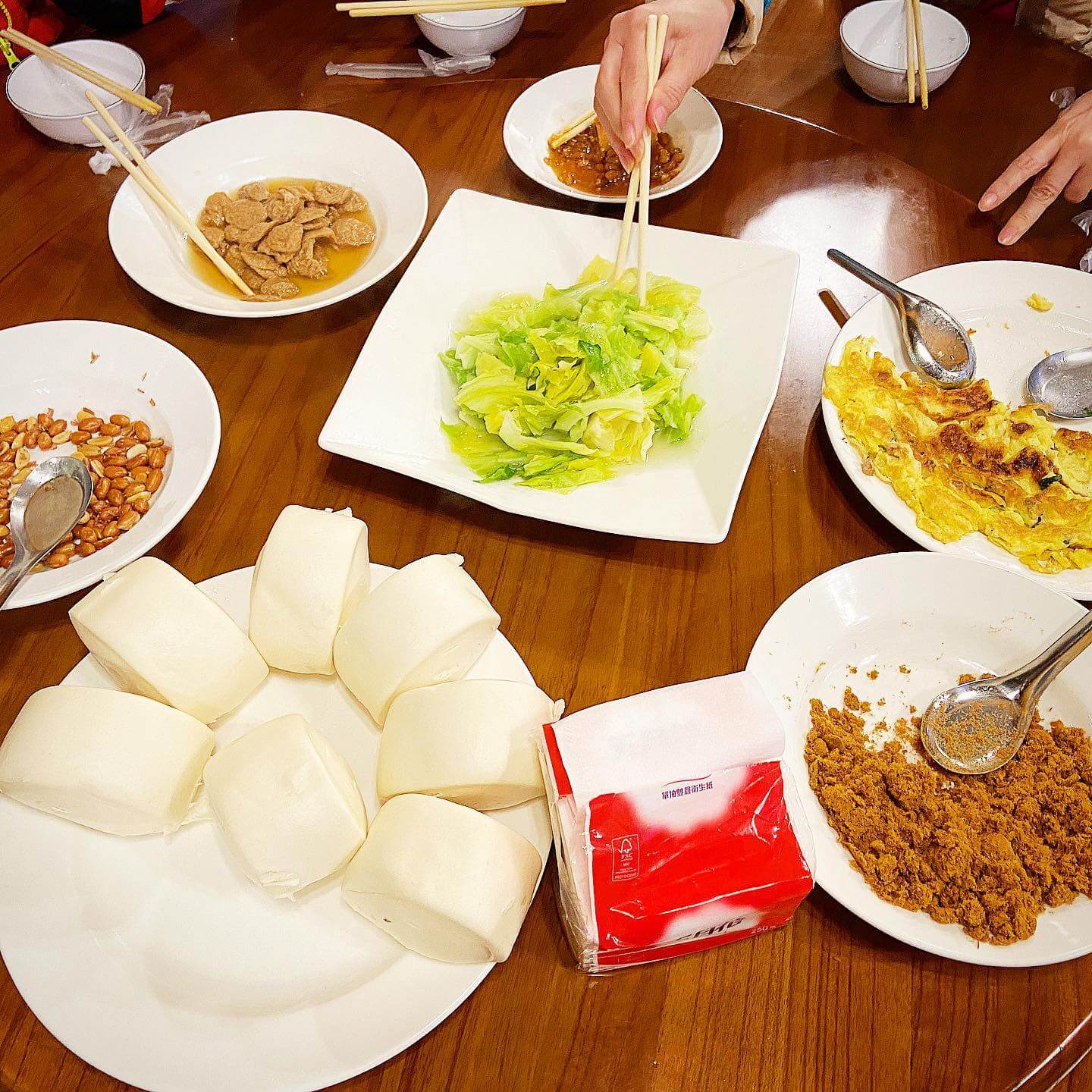 前一晚下了一點雨,早上雨勢減緩許多,我們整裝後下樓吃早餐,是很簡單的中式早餐,Sandy 客氣地說不吃饅頭,就讓我當作行動糧帶走。