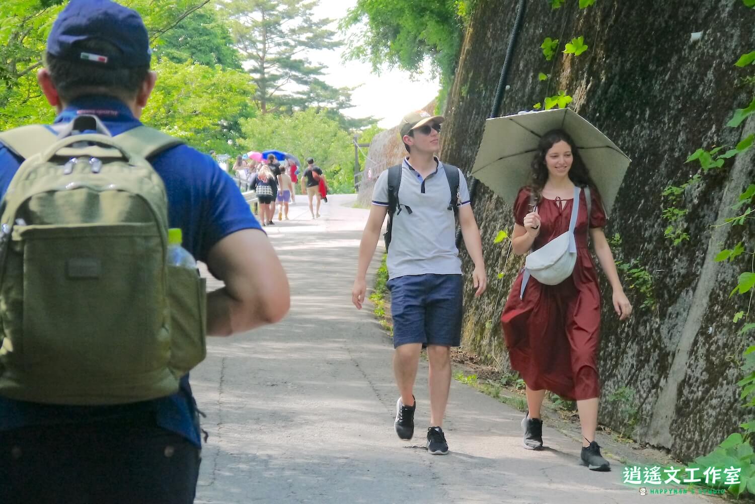 若徒步走向天守閣展望台,需要爬坡約 300 公尺,坡度有點陡,對老人家來說有點吃力,於是就返回去搭接駁巴士。爬坡雖然辛苦,然而沿途可看不同角度的合掌村,看了美景心情好,體力恢復不少。