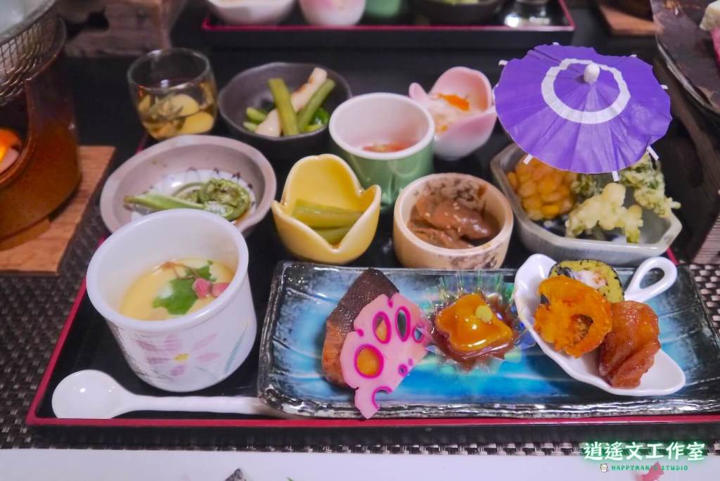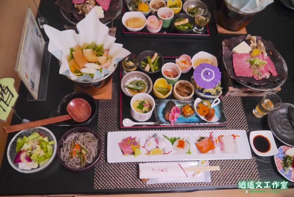 從來沒吃過懷石料理的我們,對眼前琳瑯滿目的食物感到新奇,目測至少 20 種一口料理,特別是有指火鍋、烤和牛,不僅有麵食也有飯食。似乎要把合掌村的料理都吃過「一口」。🤤