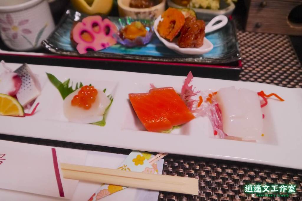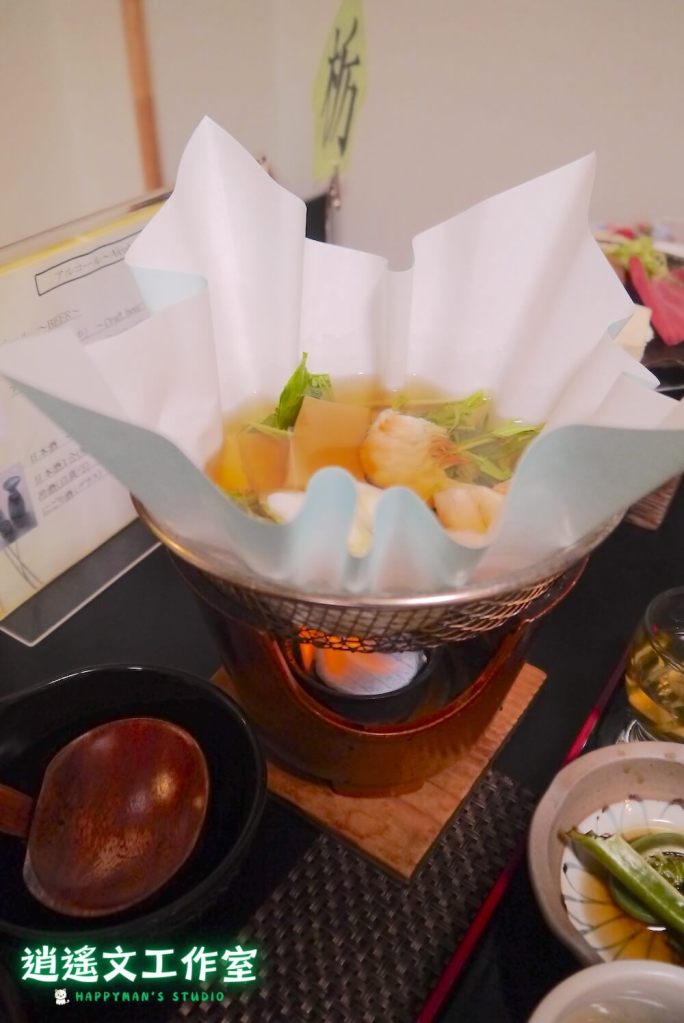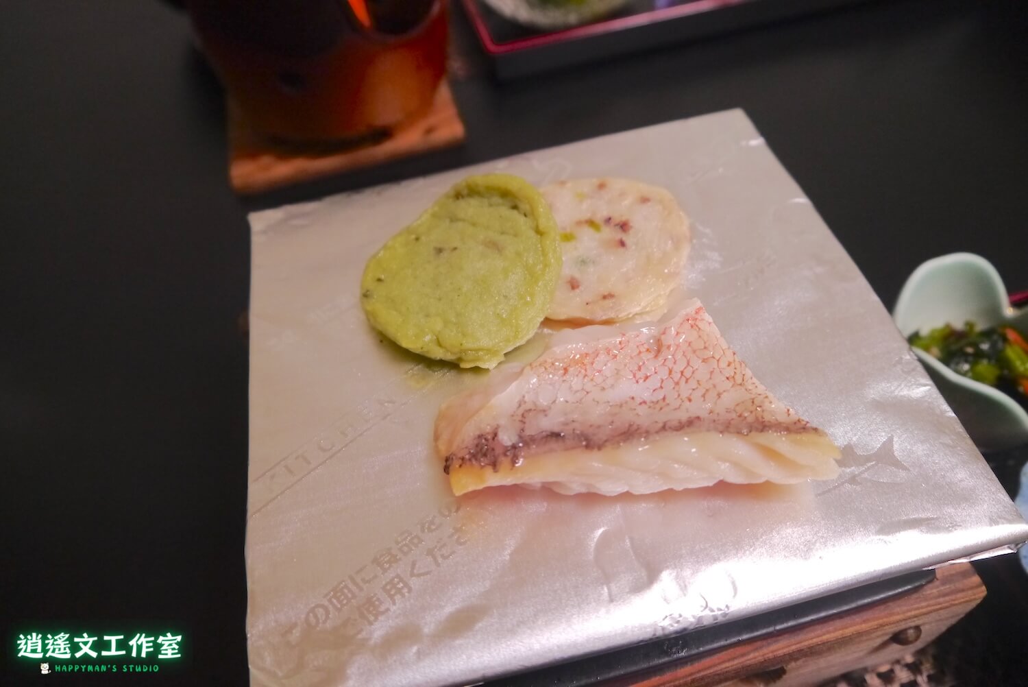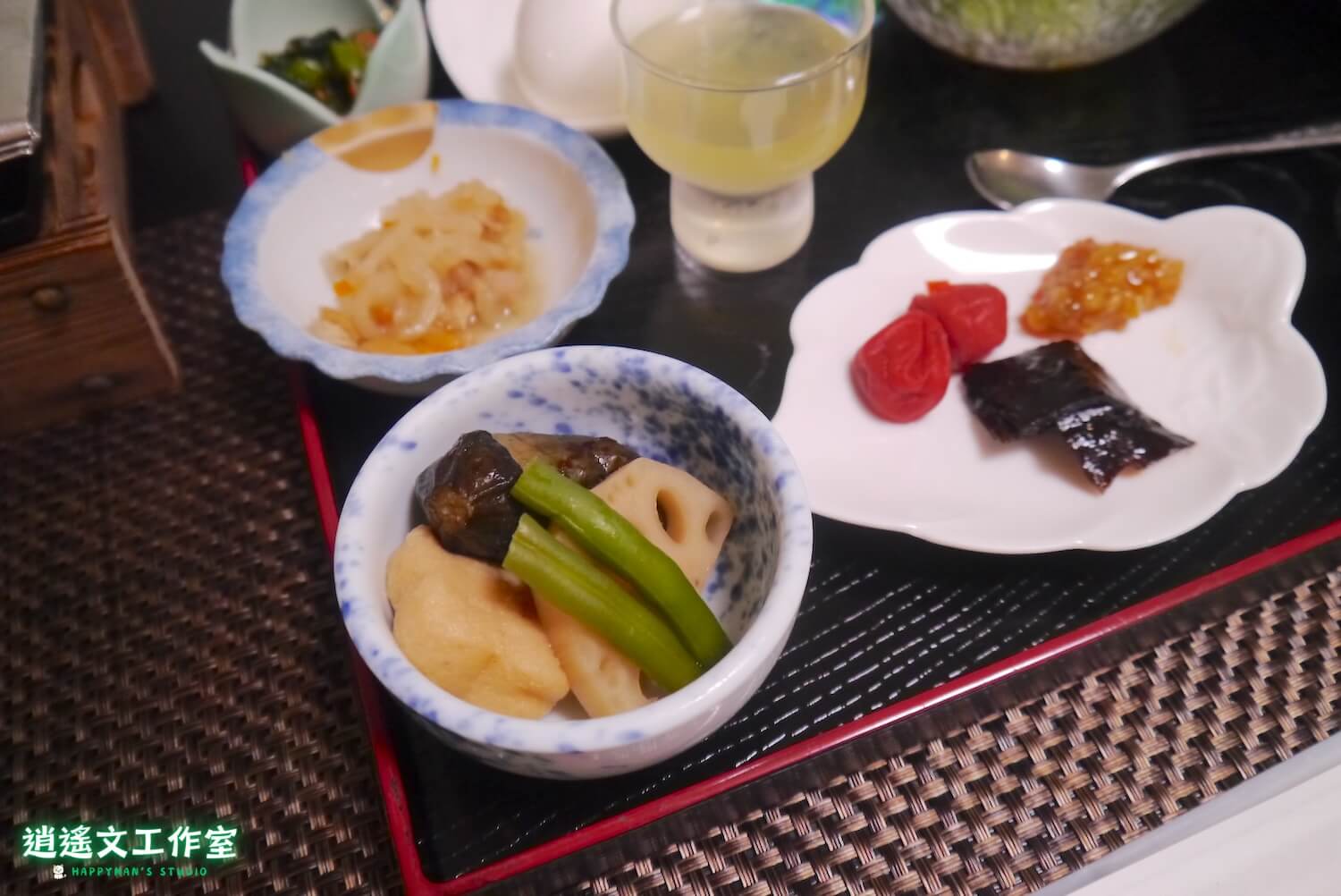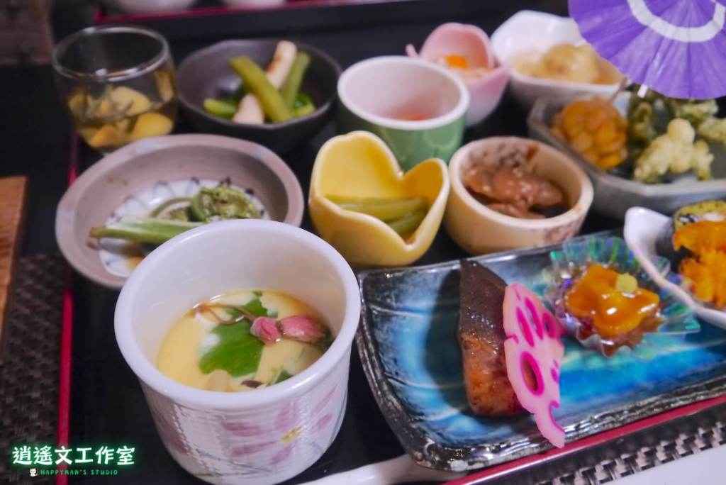 晚餐與早餐是懷石料理。我們都沒吃過日本著名的「懷石料理」,所以首次品嚐令人期待。在約定的時間回到旅館,二樓餐廳已經準備好給住客食用的套餐,在一旁有服務生等待我們入場。