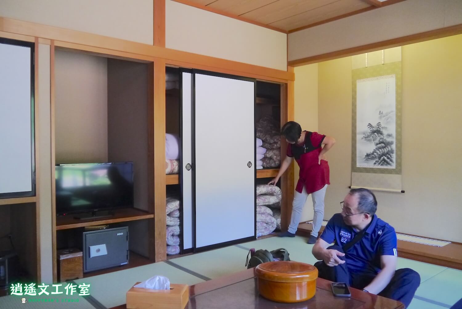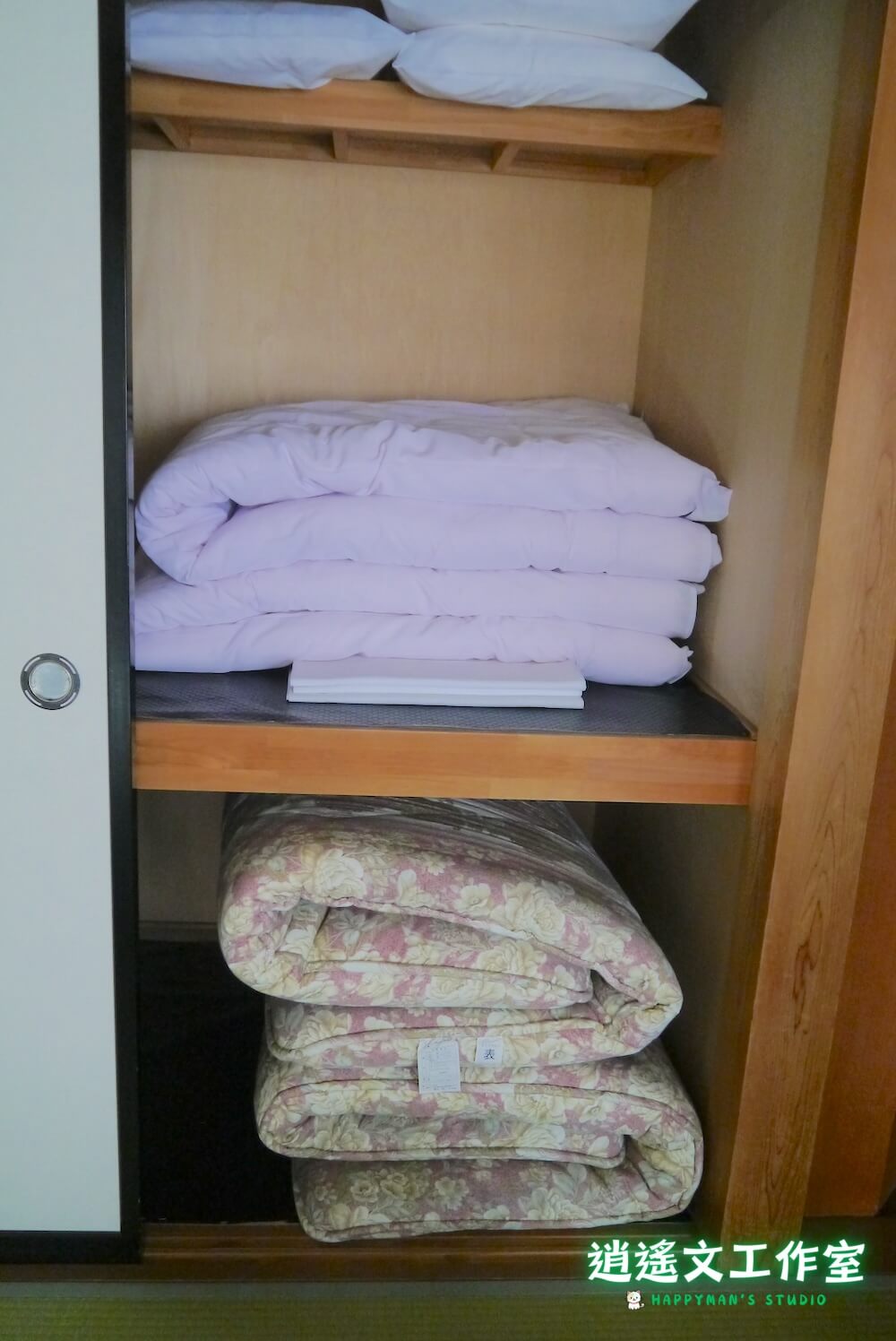 我們是在二樓的房間,是沒有附衛浴設備的榻榻米,需要走出來去上廁所。至於浴室,則是要下一樓到泡湯處,湯屋是男女裸湯分開,採開放式洗澡區,還附馬油的沐浴乳和洗髮乳。