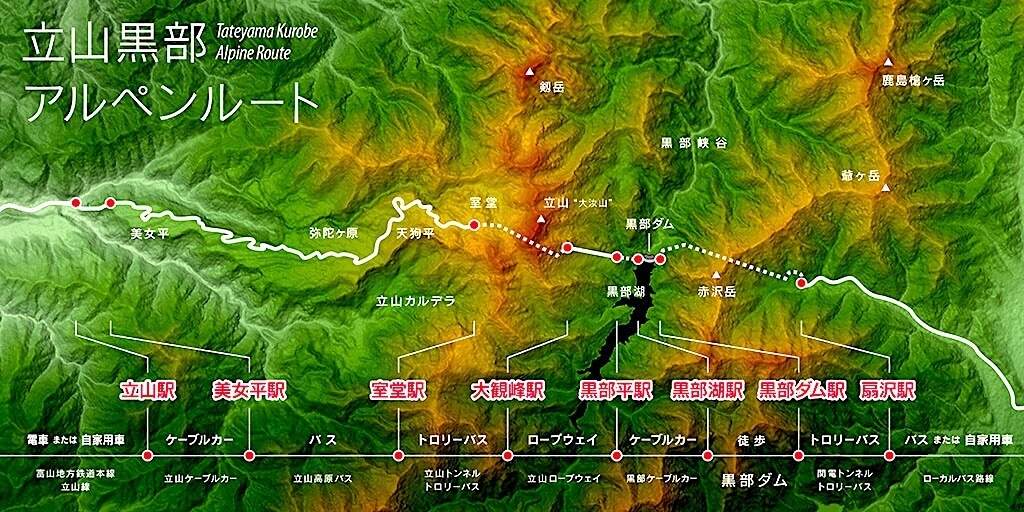 有駐足的地點陸續是:富山、立山、美女平、室堂、雪牆、大觀峰、黑部平、黑部湖、扇澤、信濃大町等等。