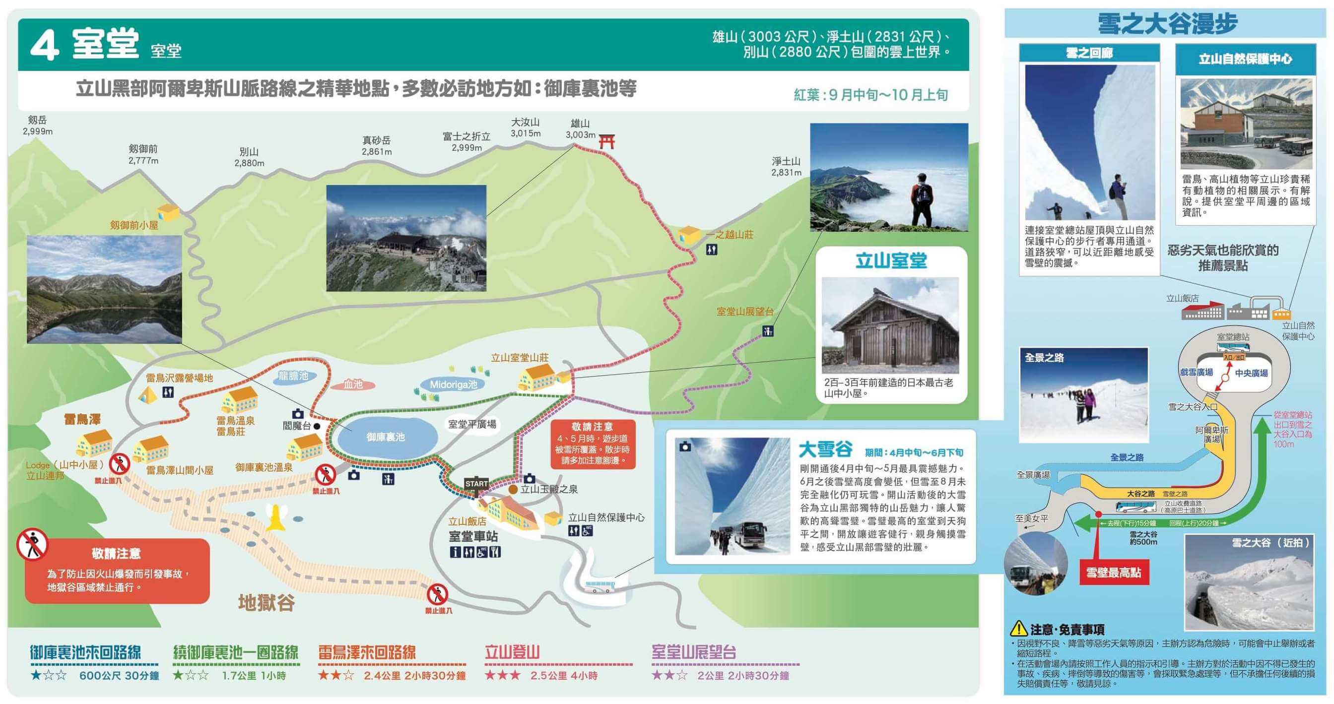 「室堂」是立山黑部阿爾卑斯山脈路線的最高處,海拔約 2450 公尺。這裡聚集了許多日本北阿爾卑斯山脈路線的熱門景點,包括最美麗的火山湖「御庫裏池」和高度逼近 20 公尺的「雪之大谷」等。