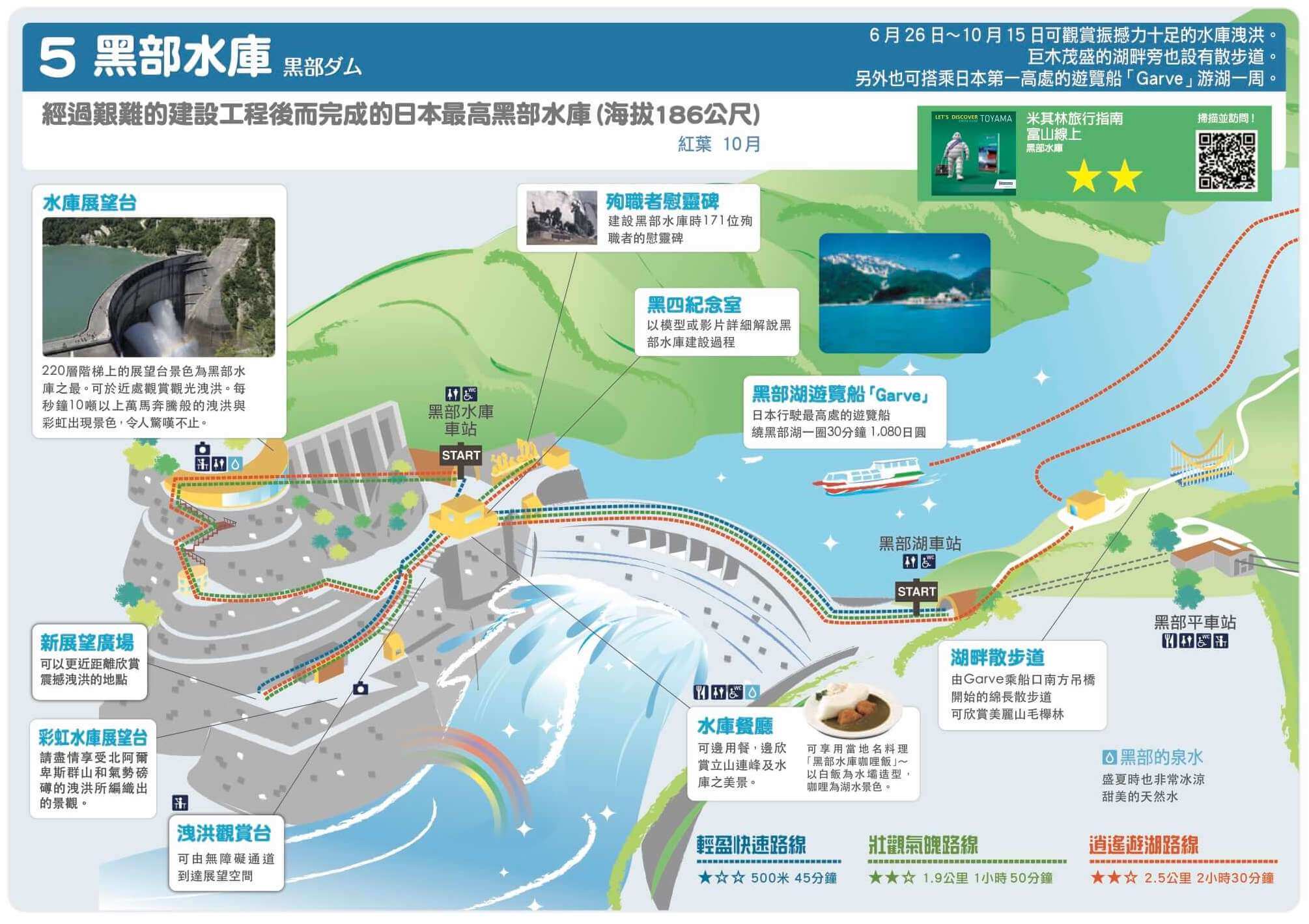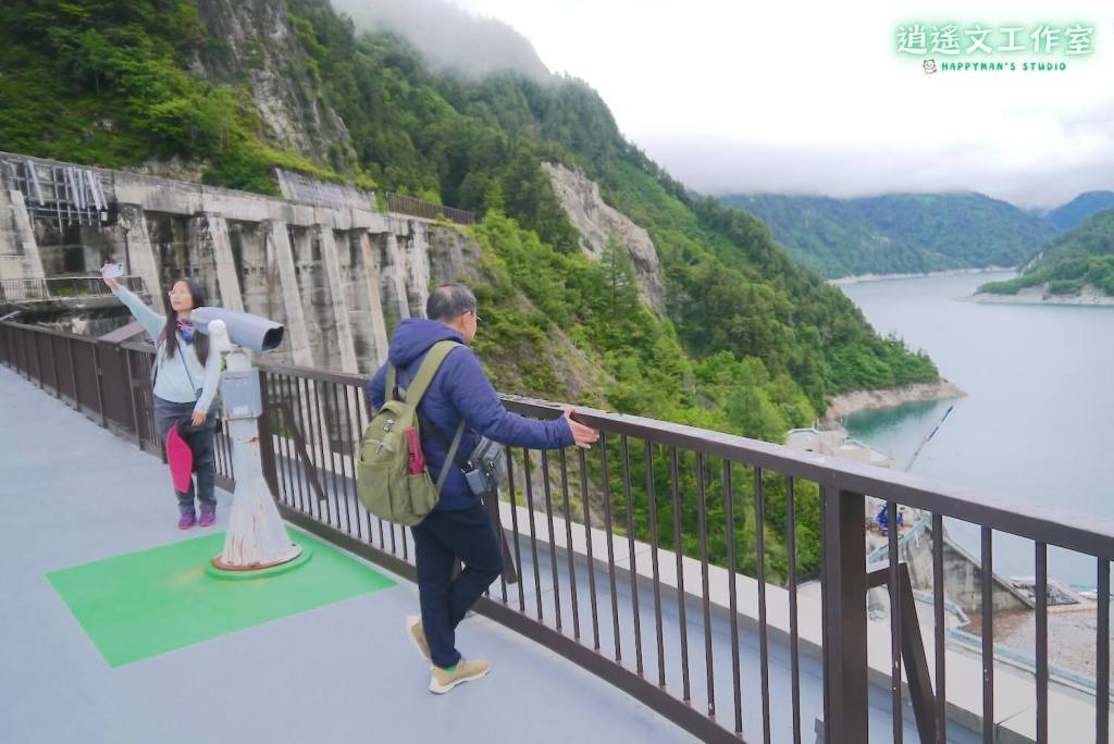 黑部水壩高 186 公尺,是日本最高、最大的水壩,也是全球名列前茅的巨大水壩。在新觀景台廣場上可以近距離觀看放水作業的場景。巨大的水流傾瀉而出,以每秒 10 噸以上的洩洪量從水壩落下的景象氣勢磅礴,令人驚嘆不已。
