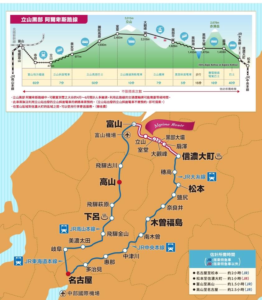 • 路線:名古屋-松本-信濃大町、名古屋-高山-富山、黑部立山全線
