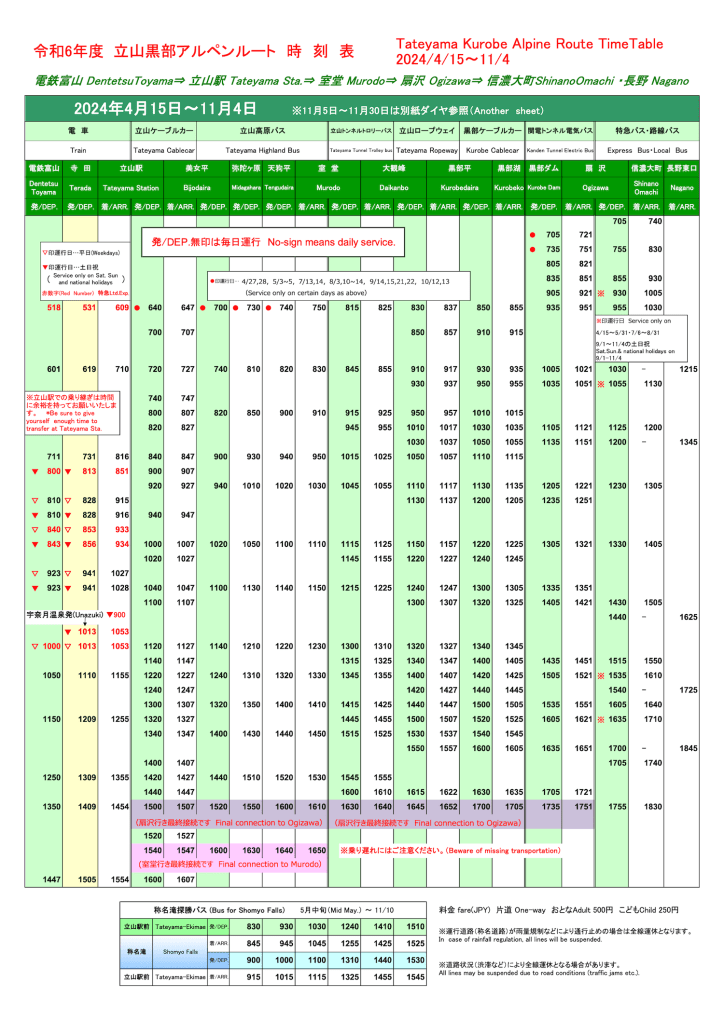 立山黑部每個點都可欣賞風景,需要留意交通時刻的安排。以下是 2024/4/15-11/4 交通時刻表。
