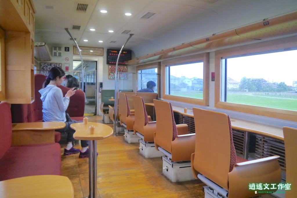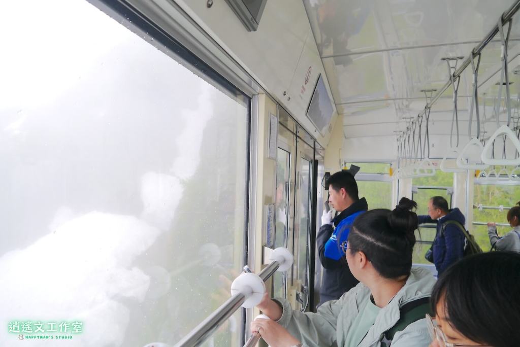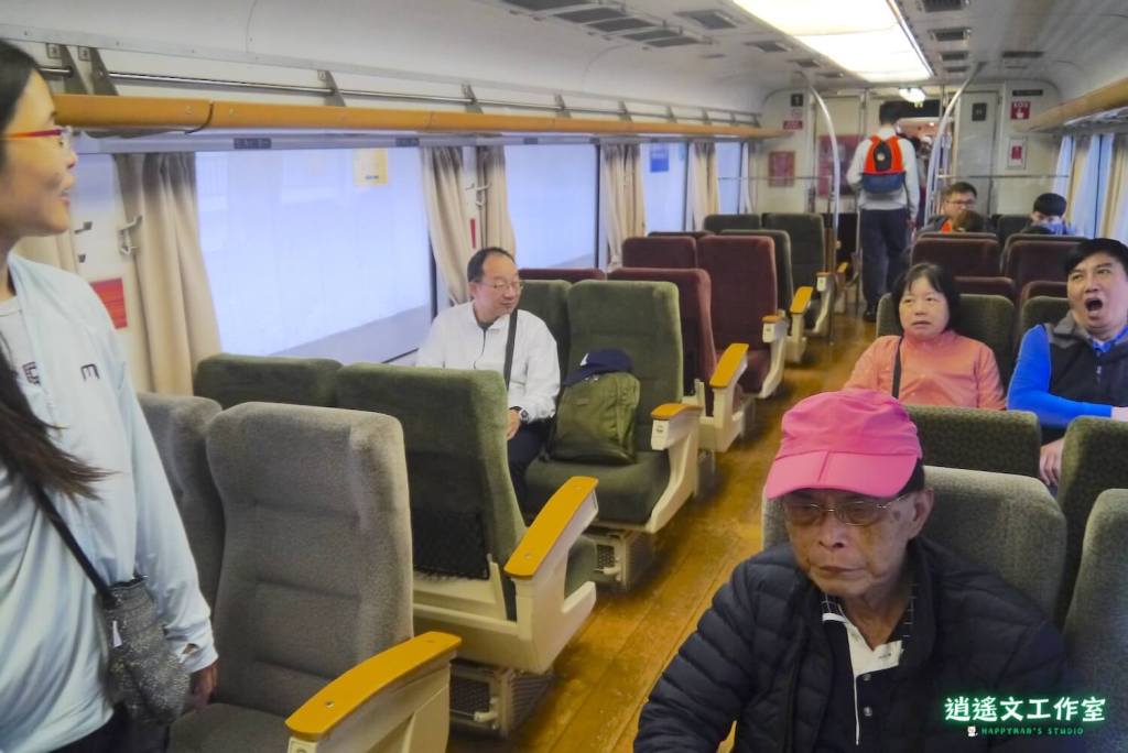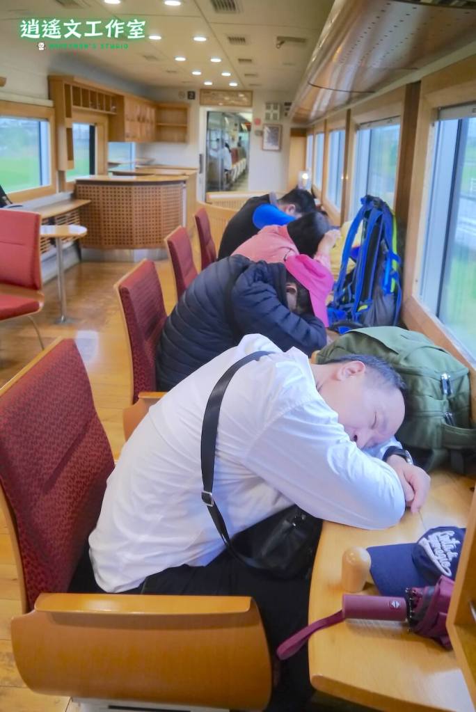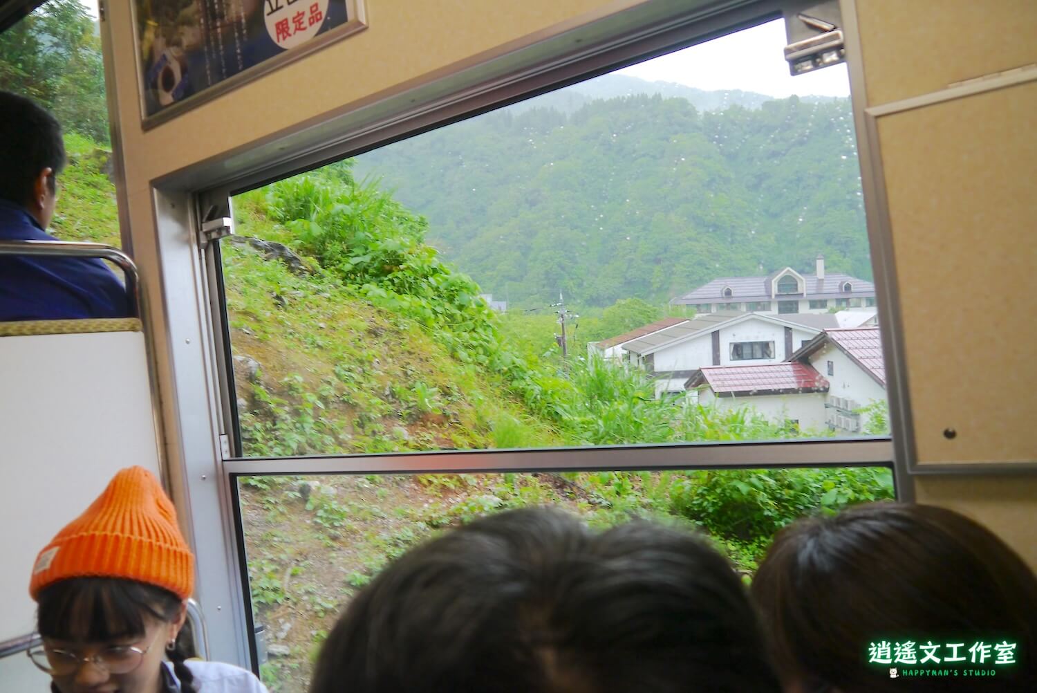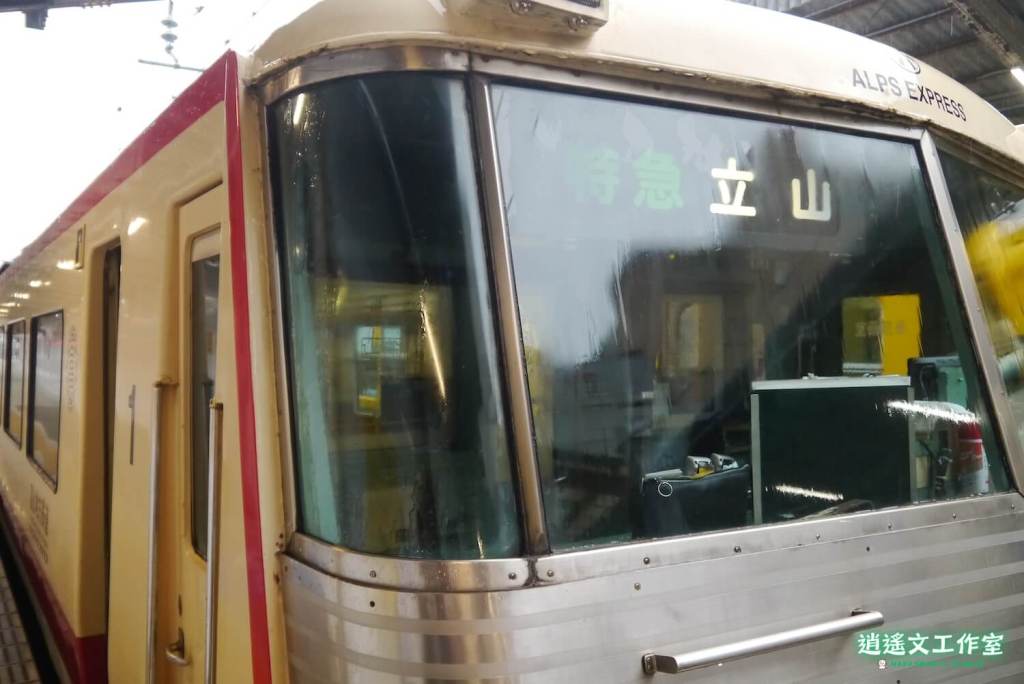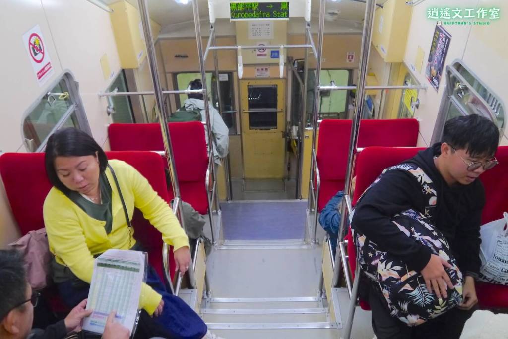 上車後,原本就坐的我們,在我發現後方有特別座位,大家便起身去第二三車廂體驗,望著窗外下雨的景色,然後小睡一下到立山站。