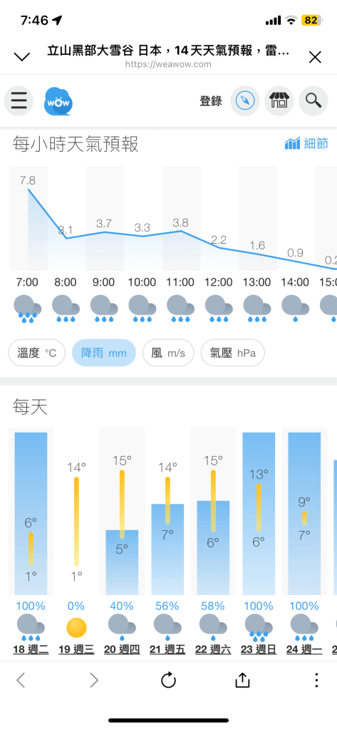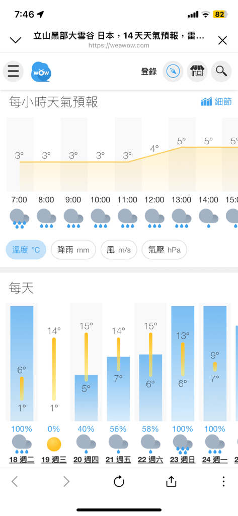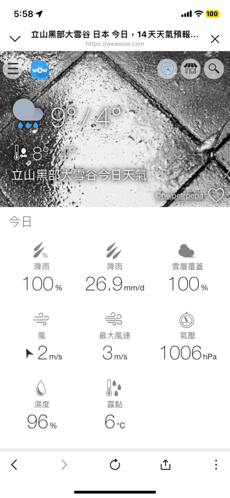 出發前幾天觀察立山黑部天氣預報,很不幸地要在雨天中度過,也就是無法看到風光明媚的景色,還得撐傘健行。