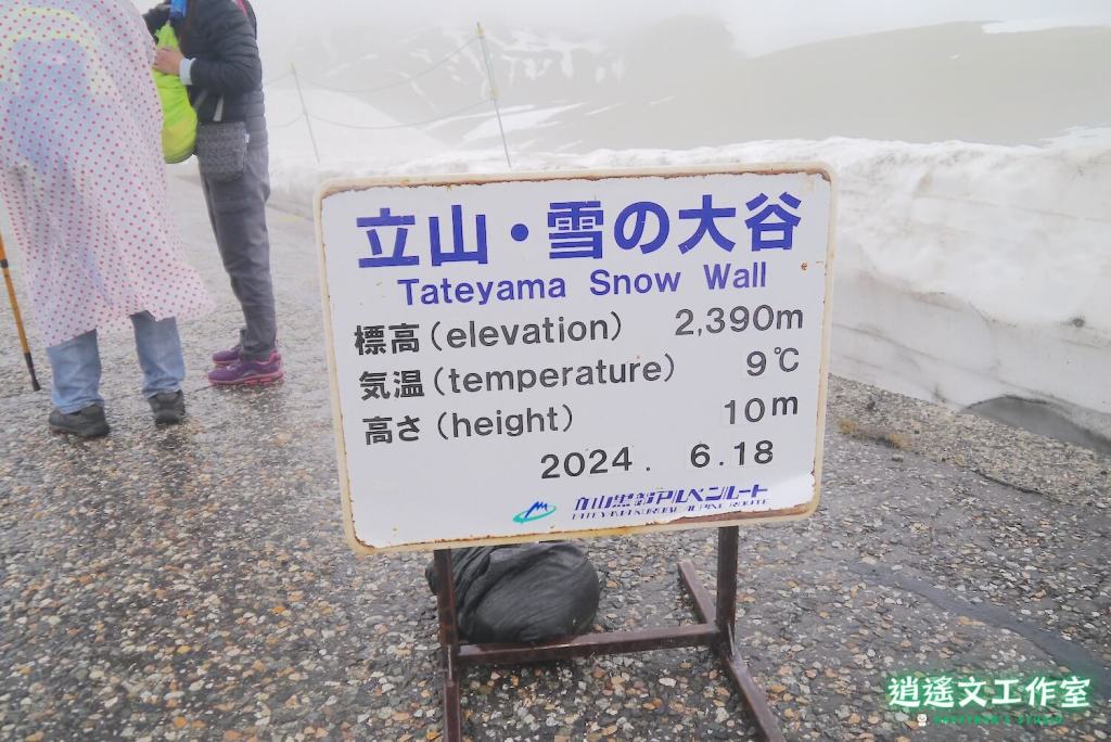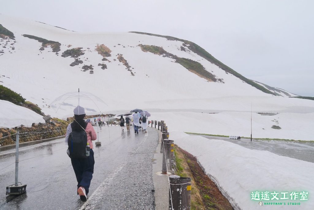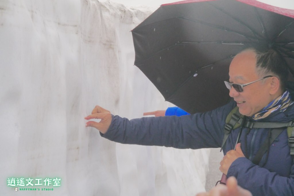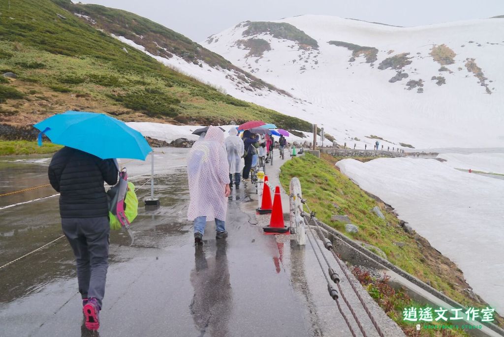 逛完室堂一圈,我們撐傘走下樓,往雪牆走去,儘管無法望遠,至少已經雨停。有遇到印度一家人,請我們幫忙合照,同樣她有回幫我們拍。