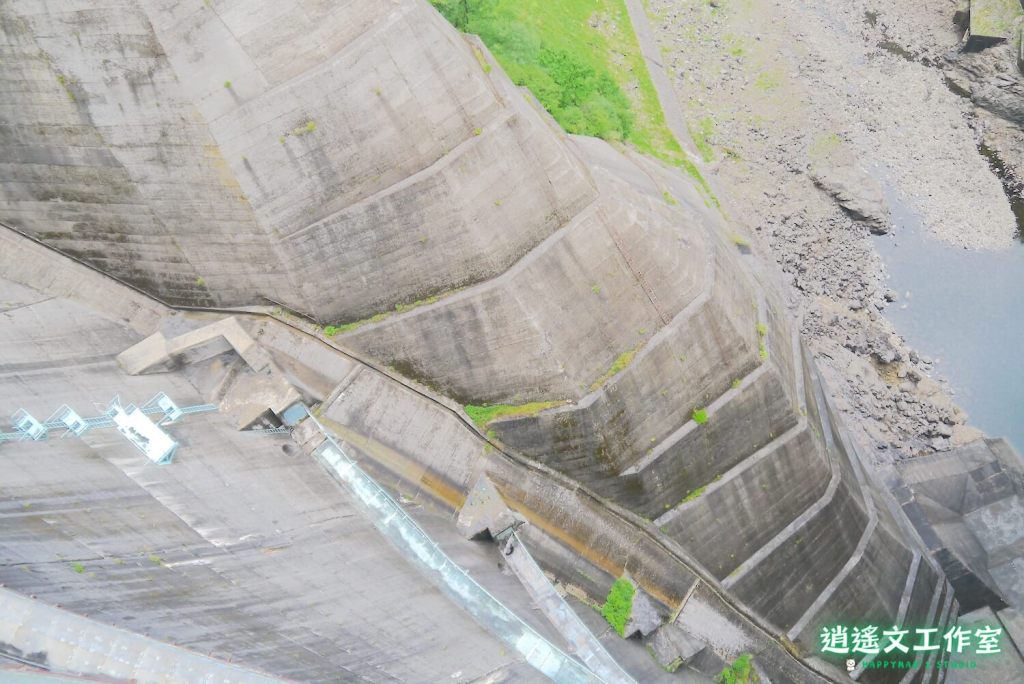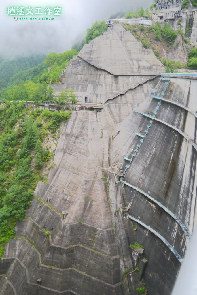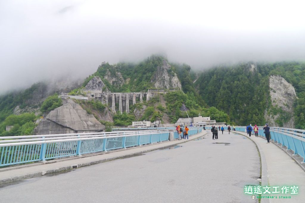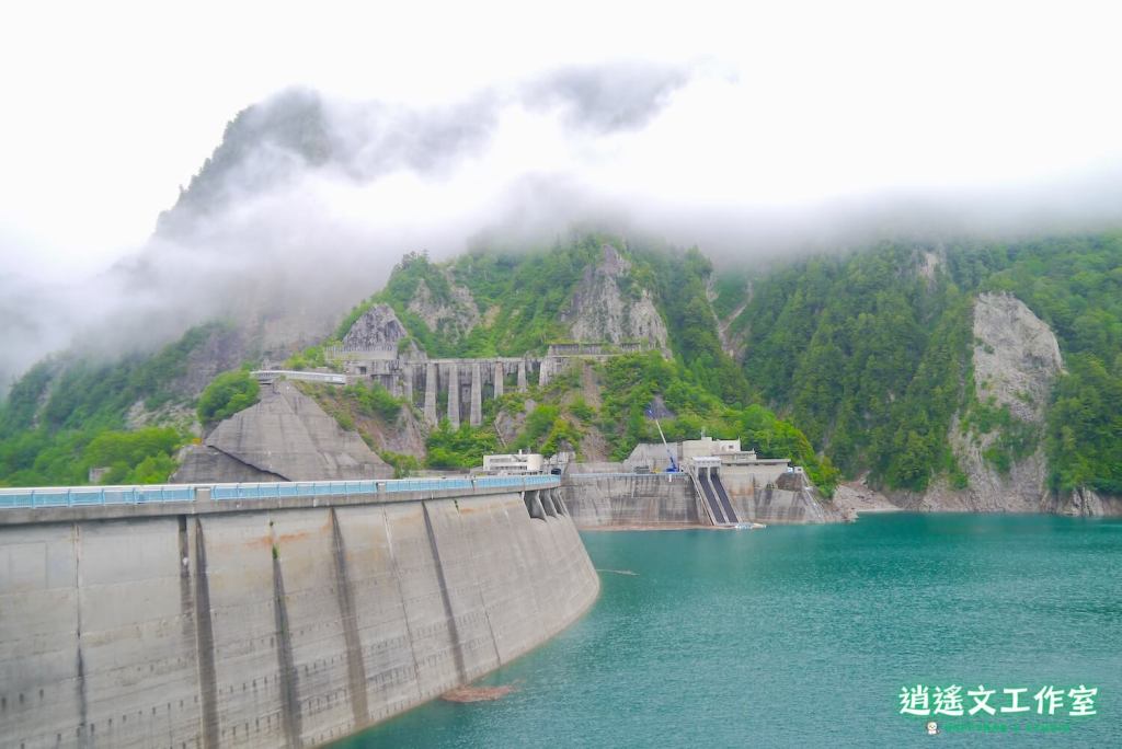 走出隧道,是日本最大的水庫-黑部水庫,前方不遠處看得到雲在不高處漂浮,在這裡沒有霧茫茫,總算可以愜意地散步看景緻。黑部水庫在 1963 年建造,走過一回後覺得真是鬼斧神工,工程期間的人員不小心犧牲了一百多位。