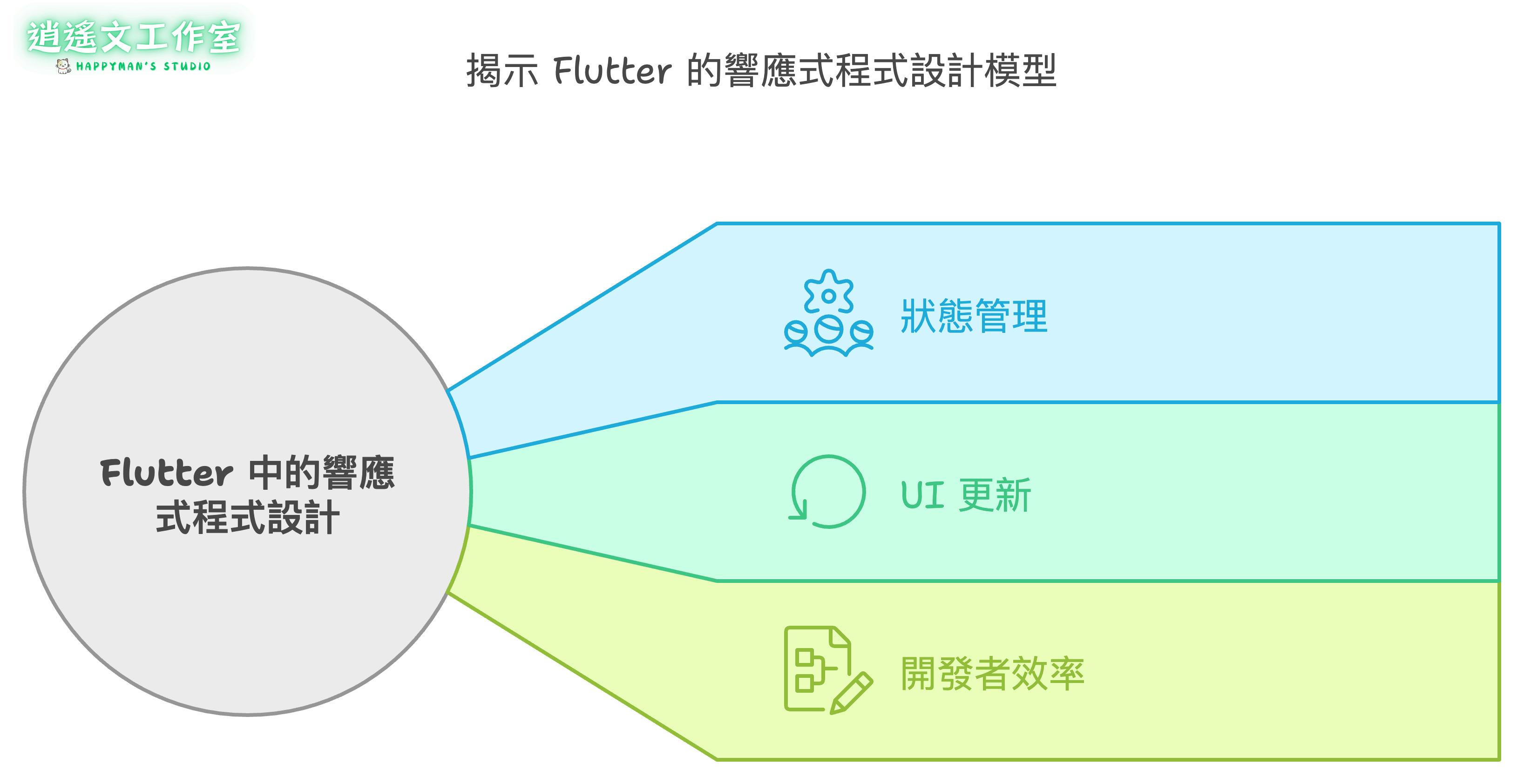 Flutter 採用響應式程式設計模型,開發者可以輕鬆管理狀態變化,並且自動更新 UI。