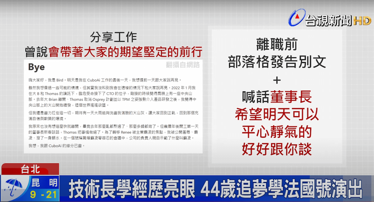 總結來說,CuboAi 內部的紛爭主要圍繞著董事長兼 CEO Thomas 的領導風格、決策方式以及其與包括前 CTO Bird 和離職員工 Renee 在內的部分員工之間的矛盾。這些矛盾涉及職場霸凌的指控、管理理念的衝突、溝通障礙以及對公司發展方向的不同看法。離職員工的公開信和疑似內部會議的錄音都揭示了公司內部存在較深層次的信任危機和不滿情緒。