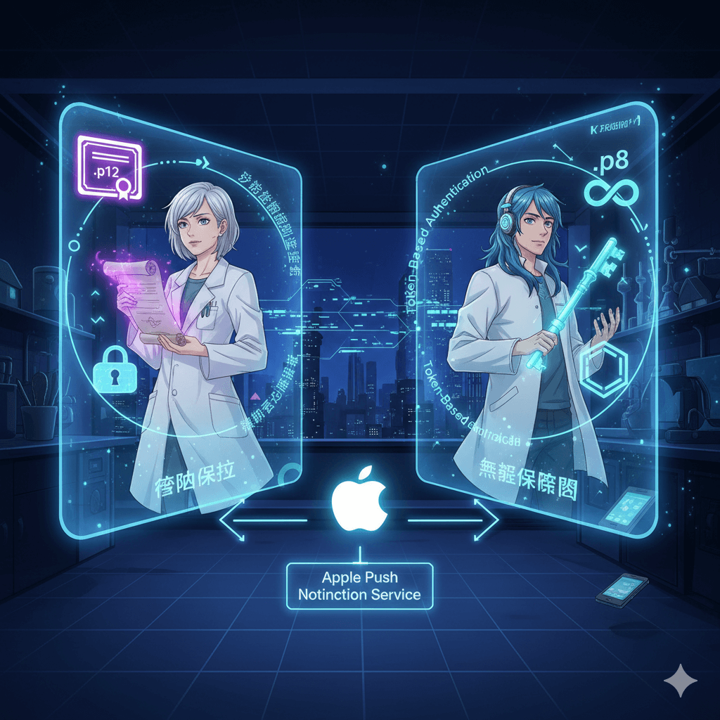 .p12:舊式 → TLS 驗證 → 必須分「開發」和「生產」憑證。.p8:新式 → JWT 驗證 → 一把金鑰支援全部環境。
