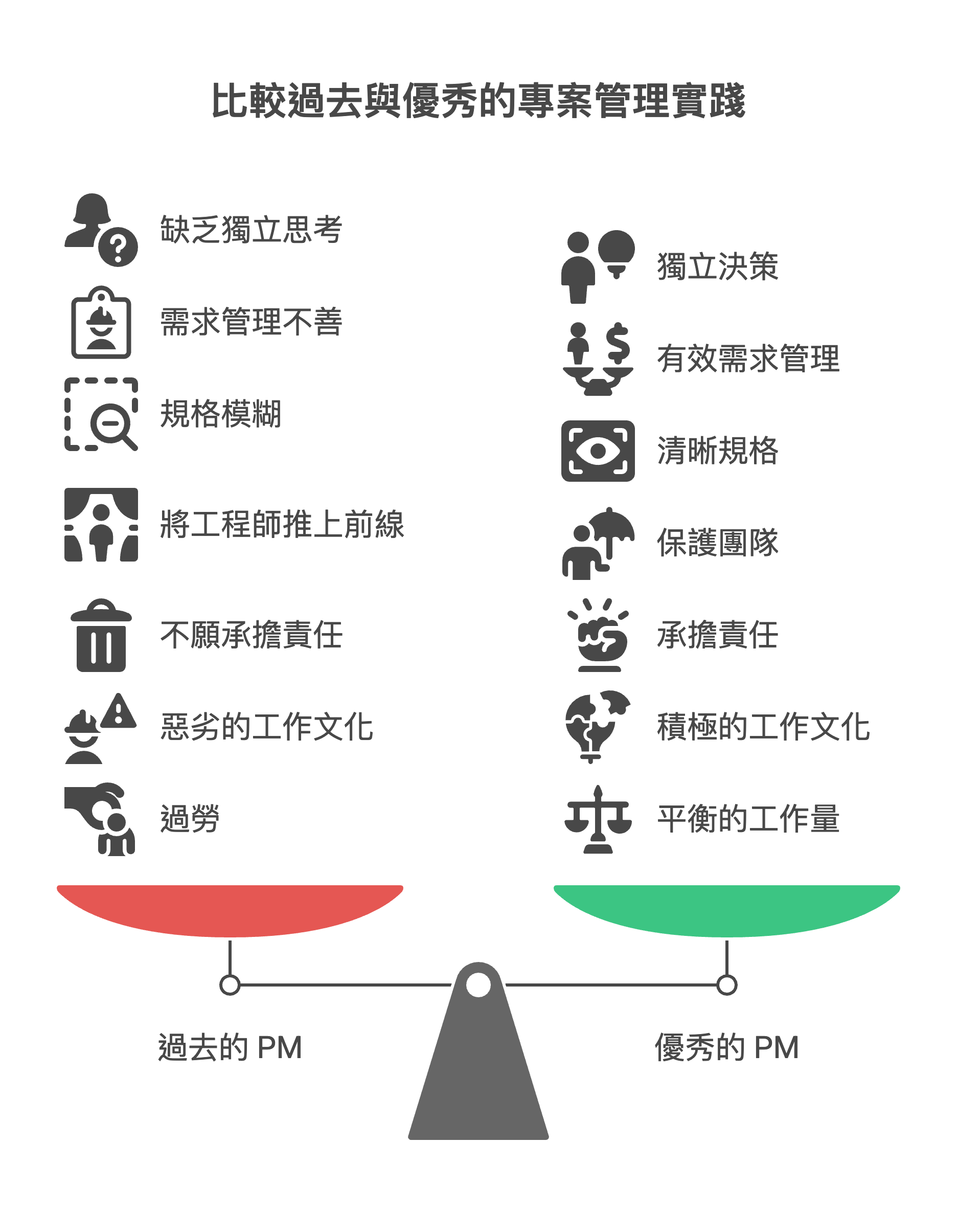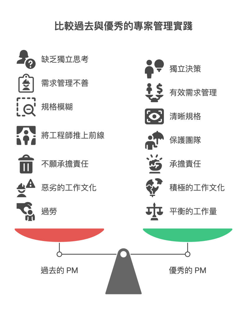 - 不願承擔責任或應對衝突: 有的 PM 不敢對需求方說「不」,導致工程師被迫接受不合理的要求。優秀的 PM 需要能夠在必要時與需求方「槓起來」,為團隊爭取權益。