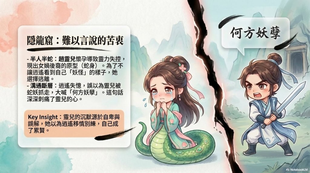 失憶後的李逍遙,在眾人面前只肯疏離地稱她為「表妹」,面對林天南的逼問更是態度含混。對靈兒而言,眼前的逍遙哥哥早已將那夜的紅燭拋諸腦後。當她因懷孕靈力不穩、即將顯現蛇妖原形時,她曾試圖向愛人發出最後的求救訊號,得到的卻是逍遙漫不經心的敷衍: