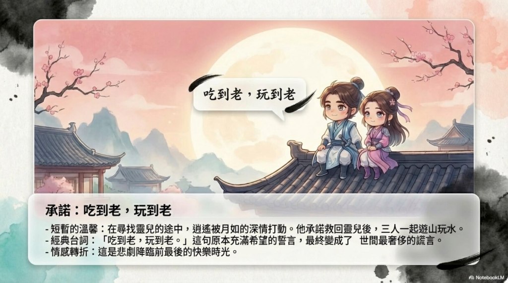 在揚州城時,李逍遙對月如的深情百般閃躲,因為當時的他滿腦子都是生死未卜的靈兒,任何情感的接納都像是一種背叛。然而到了尚書府,當他誤以為靈兒在劍聖保護下安全無虞,且月如長久以來的不離不棄已滲透進他的骨血後,他終於許下了那個著名的承諾:「吃到老,玩到老」。