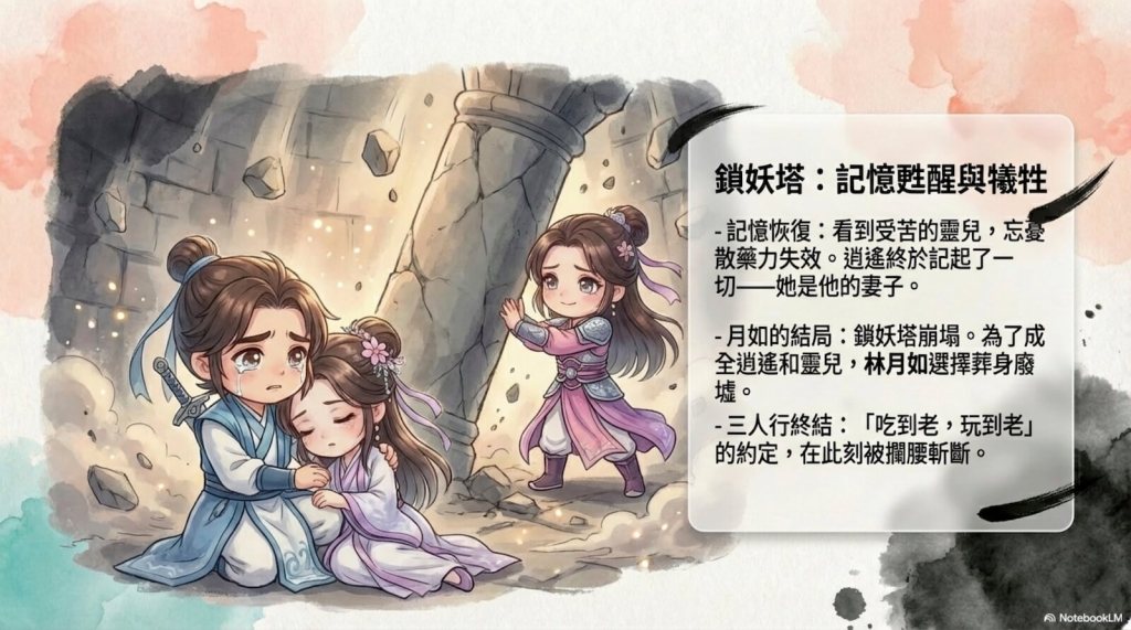 月如在生死關頭選擇犧牲自己,實踐了她那句近乎預言的告白。而這句「吃到老,玩到老」的誓言,在鎖妖塔崩塌、巨石砸落的瞬間,被命運無情地攔腰斬斷。