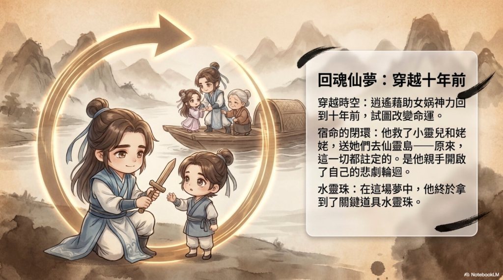 透過「回魂仙夢」,李逍遙回到了十年前。這並非一場虛幻的夢境,而是真實的時空穿越——他在夢中換回的水靈珠與獲得的經驗,便是跨越時空的證物。