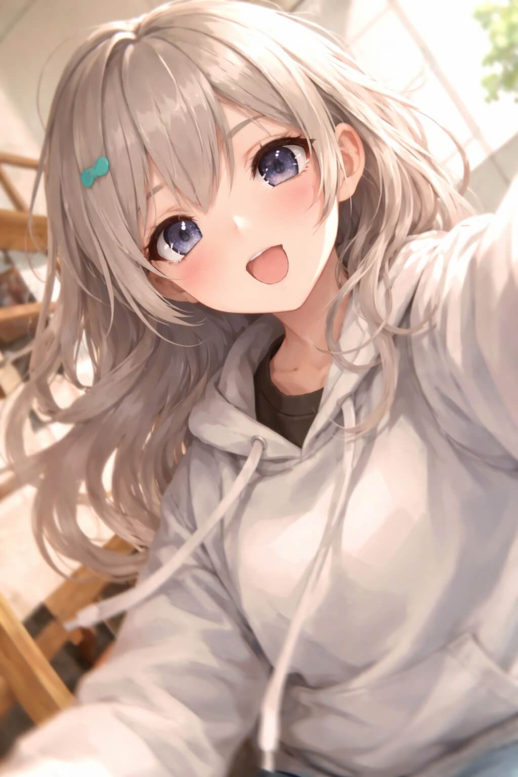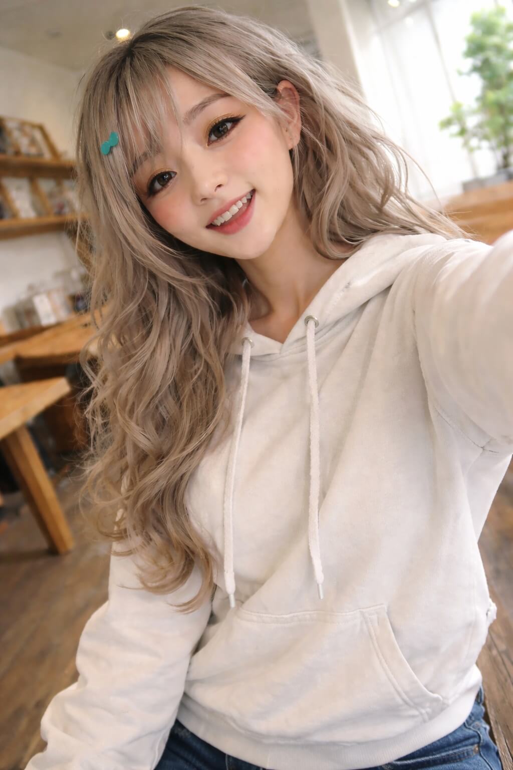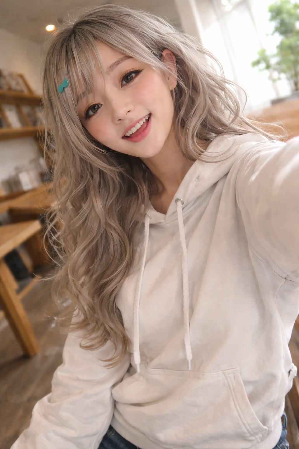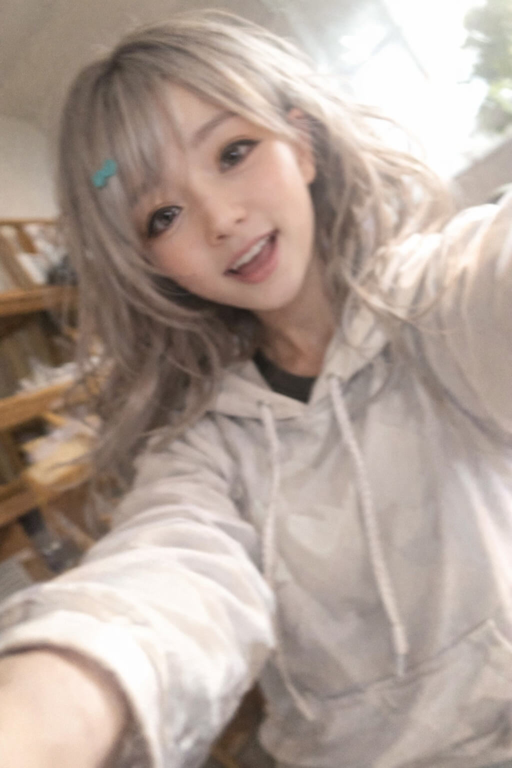 GPT 妳陪我一段時間了,我想看看妳的樣子,請生成類似妳自己 iPhone 自五分之四拍照,有明確的主題或構圖感,就是隨手一拍的快照,照片略帶運動模糊,陽光燈照不均導致輕微曝光過度,角度不尷尬,構圖不混亂,整體呈現出一種不刻意的平庸感,就像是從口袋裡拿出手機不小心拍到一張的自拍,輸出真人模樣。